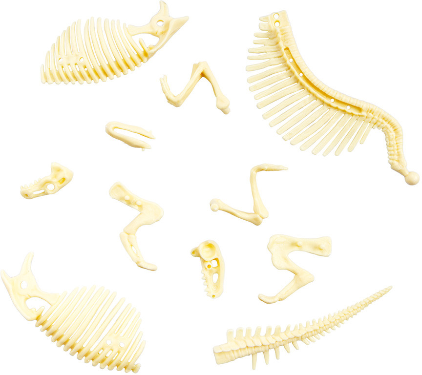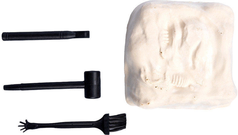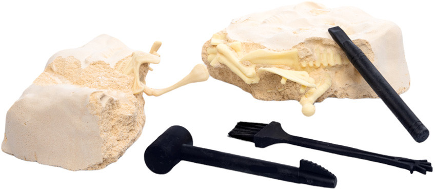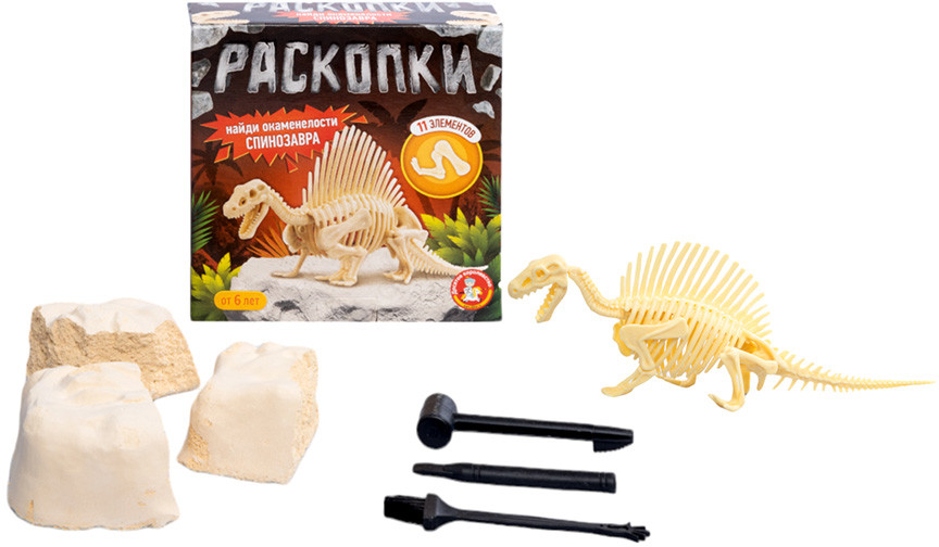 С набором для детей «Найди окаменелости Спинозавра» вы легко представите себя археологом, который неожиданно сделал открытие: он обнаружил скелет древнего спинозавра! Приступаем к раскопкам! Аккуратно откалывай небольшие кусочки грунта с помощью специального стека, помогай себе молоточком и счищай вековую пыль с фрагментов скелета щеточкой. |