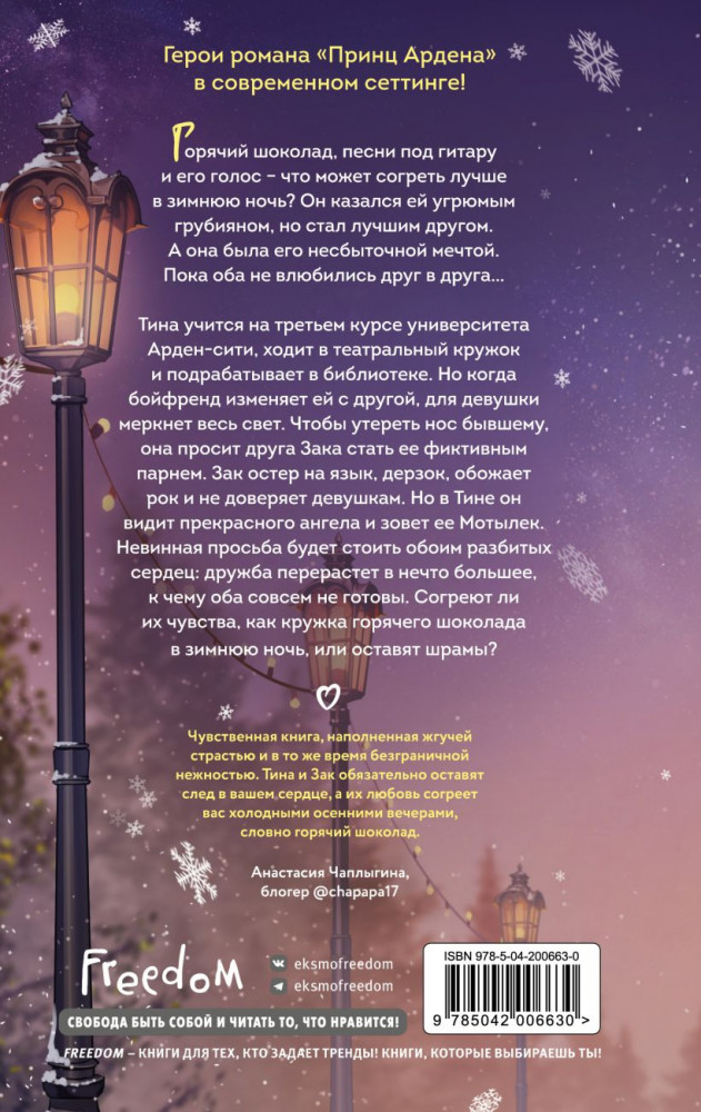 Тина учится на третьем курсе университета Арден-сити, ходит в театральный кружок и подрабатывает в библиотеке. Но когда бойфренд изменяет ей с другой, для девушки меркнет весь свет. Чтобы утереть нос бывшему, она просит друга Зака стать ее фиктивным парнем. Зак остер на язык, дерзок, обожает рок и не доверяет девушкам. Но в Тине он видит прекрасного ангела и зовет ее Мотылек. Невинная просьба будет стоить обоим разбитых сердец: дружба перерастет в нечто большее, к чему оба совсем не готовы. Согреют ли их чувства, как кружка горячего шоколада в зимнюю ночь, или оставят шрамы? |