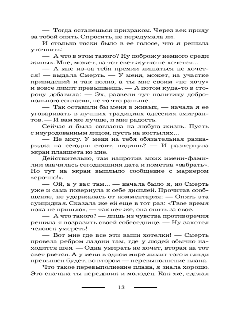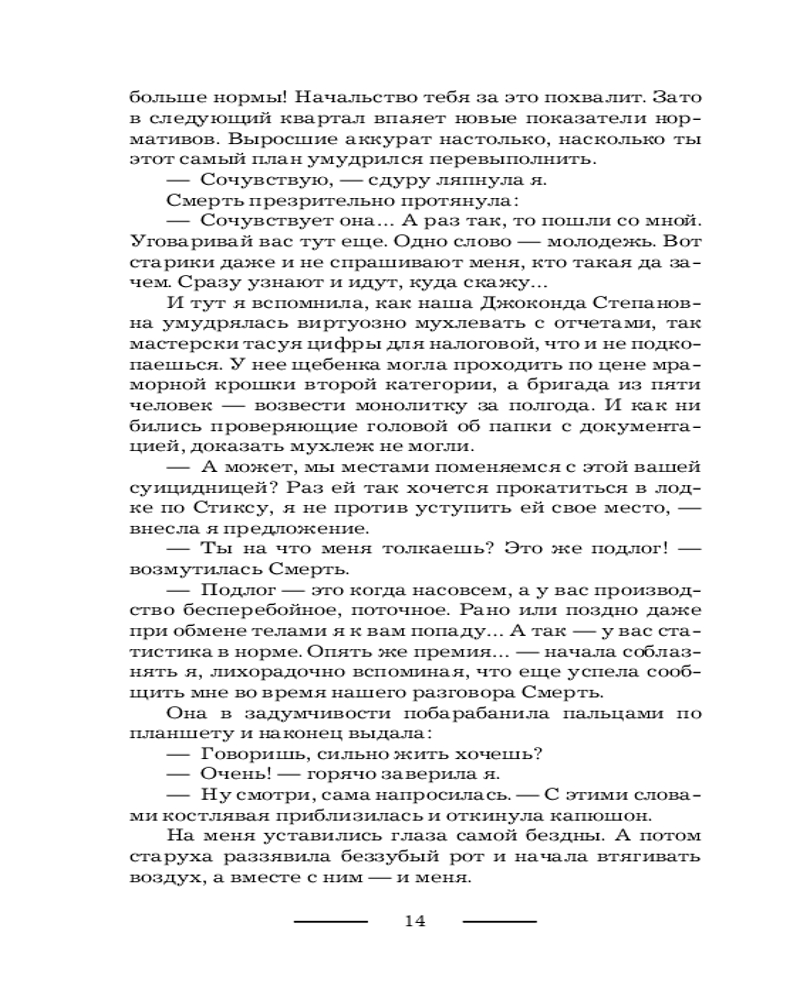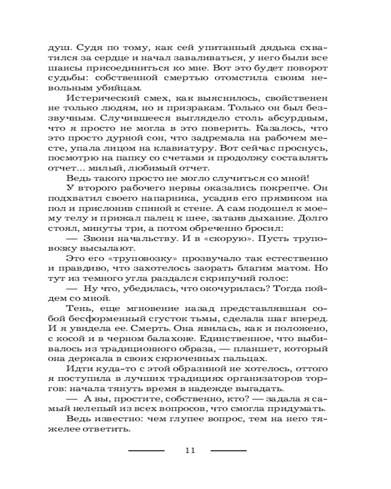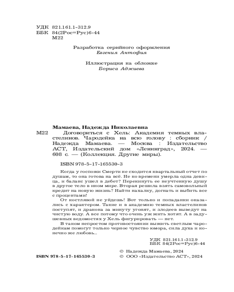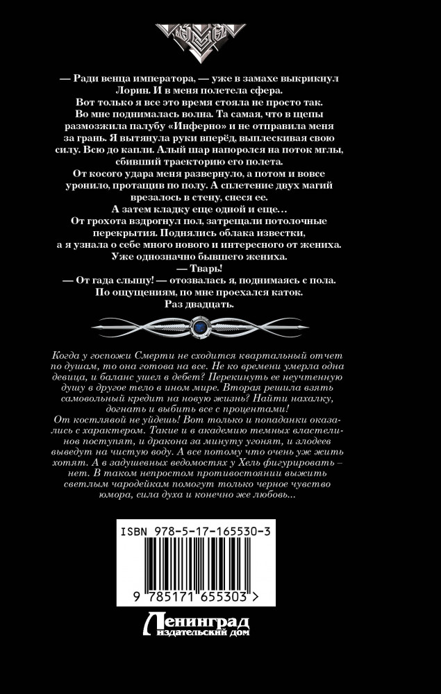 💳 Оплатить за товар можно при получении 🇰🇿 Есть бесплатная доставка по Казахстану от 1 дня 🎁 Копите бонусы с каждой покупки Серия: Коллекция. Другие миры Когда у госпожи Смерти не сходится квартальный отчет по душам, то она готова на всё. Не ко времени умерла одна деви- ца, и баланс ушел в дебет? Перекинуть ее неучтенную душу в другое тело в ином мире. Вторая решила взять самовольный кредит на новую жизнь? Найти нахалку, догнать и выбить все с процентами! От костлявой не уйдешь! Вот только и попаданки оказа- лись с характером. Такие и в академию темных властелинов поступят, и дракона за минуту угонят, и злодеев выведут на чистую воду. А все потому что очень уж жить хотят. А в заду- шевных ведомостях у Хель фигурировать — нет. В таком непростом противостоянии выжить светлым чаро- дейкам помогут только черное чувство юмора, сила духа и ко- нечно же любовь... |