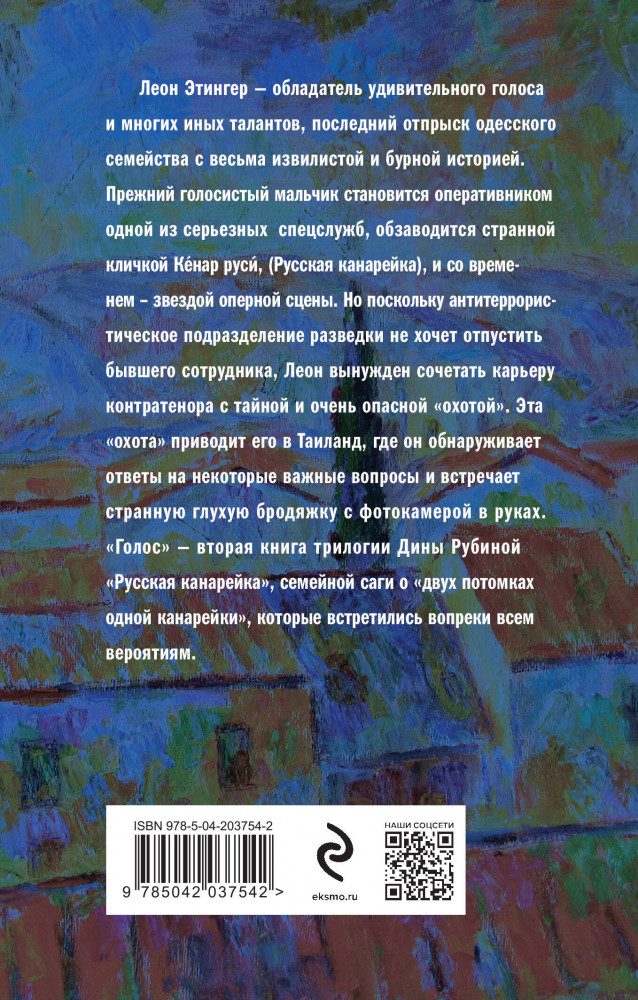 В данный момент этот товар отсутствует в продаже. Возможно, у нас найдется аналогичный или похожий товар здесь. Серия: Большая проза Дины Рубиной (обложка) Леон Этингер — обладатель удивительного голоса и многих иных талантов, последний отпрыск одесского семейства с весьма извилистой и бурной историей. Прежний голосистый мальчик становится оперативником одной из серьезных спецслужб, где обзаводится странной кличкой «Кéнар руси´» (Русская канарейка), а со временем превращается в звезду оперной сцены. Но поскольку антитеррористическое подразделение разведки не хочет отпустить бывшего сотрудника, Леон вынужден сочетать карьеру контратенора с тайной и очень опасной «охотой». Эта охота приводит его в Таиланд, где он обнаруживает ответы на некоторые важные вопросы и встречает странную глухую бродяжку с фотокамерой в руках.