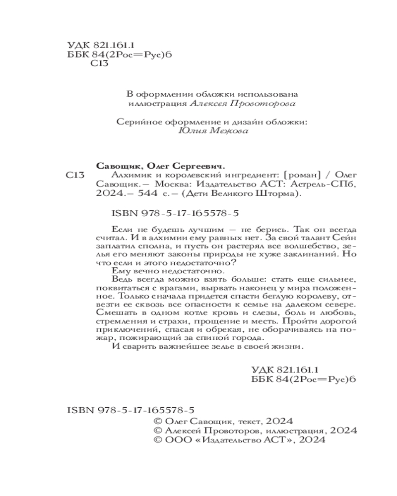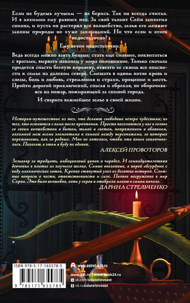 💳 Оплатить за товар можно при получении 🇰🇿 Есть бесплатная доставка по Казахстану от 1 дня 🎁 Копите бонусы с каждой покупки Серия: Дети великого шторма Если не будешь лучшим — не берись. Так он всегда считал. И в алхимии ему равных нет. За свой талант Сейн заплатил сполна, и пусть он растерял все волшебство, зелья его меняют законы природы не хуже заклинаний. Но что если и этого недостаточно? Ему вечно недостаточно. Ведь всегда можно взять больше: стать еще сильнее, поквитаться с врагами, вырвать наконец у мира положенное. Только сначала придется спасти беглую королеву, отвезти ее сквозь все опасности к семье на далеком севере. Смешать в одном котле кровь и слезы, боль и любовь, стремления и страхи, прощение и месть. Пройти дорогой приключений, спасая и обрекая, не оборачиваясь на пожар, пожирающий за спиной города. И сварить важнейшее зелье в своей жизни. |