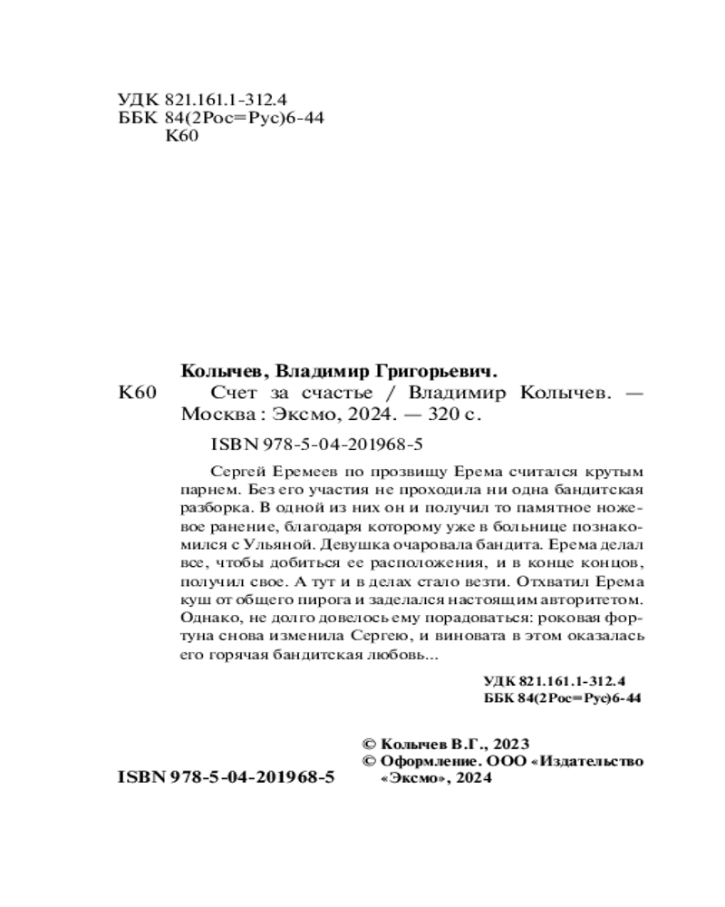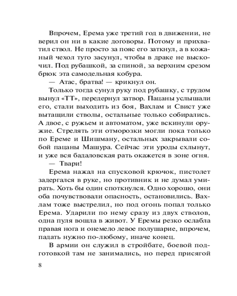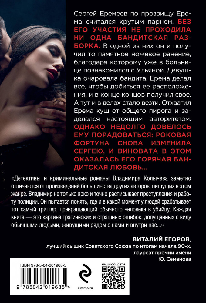 В данный момент этот товар отсутствует в продаже. Возможно, у нас найдется аналогичный или похожий товар здесь. Серия: Колычев. Роковой соблазн (обложка) Сергей Еремеев по прозвищу Ерема считался крутым парнем. Без его участия не проходила ни одна бандитская разборка. В одной из них он и получил то памятное ножевое ранение, благодаря которому уже в больнице познакомился с Ульяной. Девушка очаровала бандита. Ерема делал все, чтобы добиться ее расположения, и, в конце концов, получил свое. А тут и в делах стало везти. Отхватил Ерема куш от общего пирога и заделался настоящим авторитетом. Однако недолго довелось ему порадоваться: роковая фортуна снова изменила Сергею, и виновата в этом оказалась его горячая бандитская любовь...