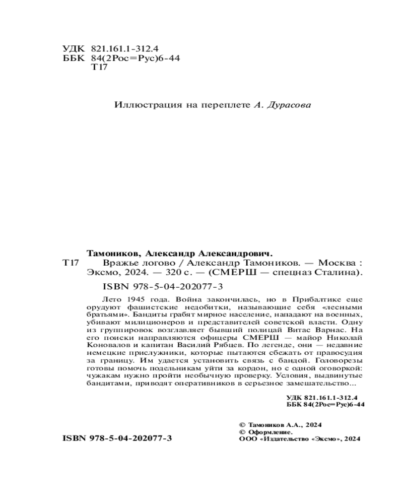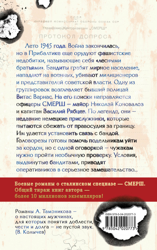 💳 Оплатить за товар можно при получении 🇰🇿 Есть бесплатная доставка по Казахстану от 1 дня 🎁 Копите бонусы с каждой покупки Серия: Смерш — спецназ Сталина Лето 1945 года. Война закончилась, но в Прибалтике еще орудуют фашистские недобитки, называющие себя «лесными братьями». Бандиты грабят мирное население, нападают на военных, убивают милиционеров и представителей Советской власти. Одну из группировок возглавляет бывший полицай Витас Варнас. На его поиски направляются офицеры СМЕРШ — майор Николай Коновалов и капитан Василий Рябцев. По легенде они — недавние немецкие прислужники, которые пытаются сбежать от правосудия за границу. Им удается установить связь с бандой. Головорезы готовы помочь подельникам уйти за кордон, но с одной оговоркой: чужакам нужно пройти необычную проверку. Условия, выдвинутые бандитами, приводят оперативников в серьезное замешательство... |