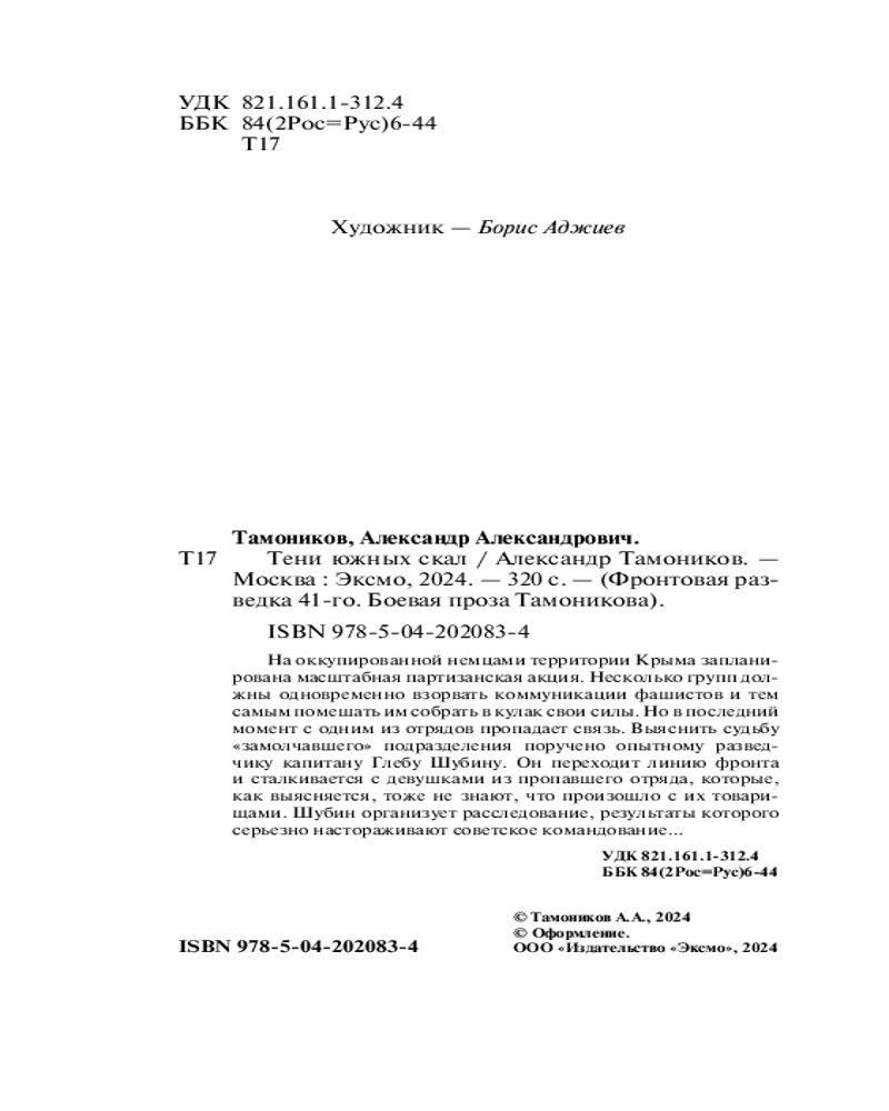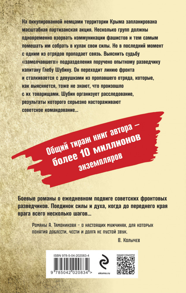 В данный момент этот товар отсутствует в продаже. Возможно, у нас найдется аналогичный или похожий товар здесь. Серия: Фронтовая разведка 41-го. Боевая проза Тамоникова Боевые романы о ежедневном подвиге советских фронтовых разведчиков. Поединок силы и духа, когда до переднего края врага всего несколько шагов. Подробности жестоких боев, о которых не рассказывают даже ветераны-участники тех событий.