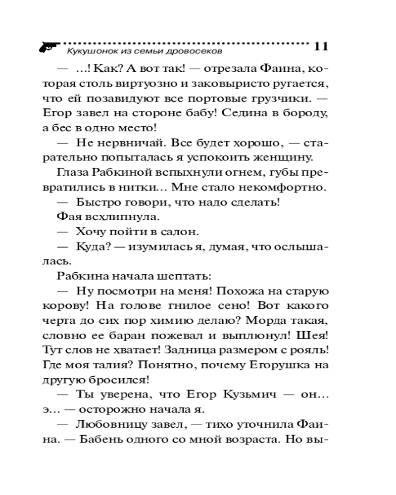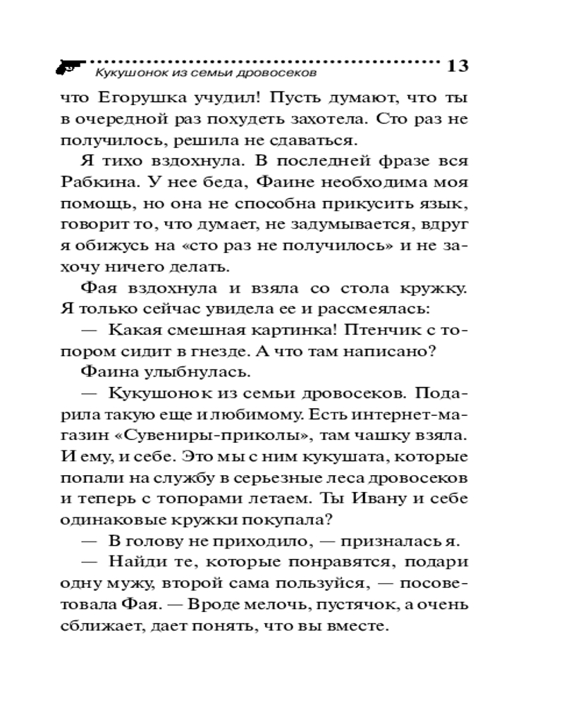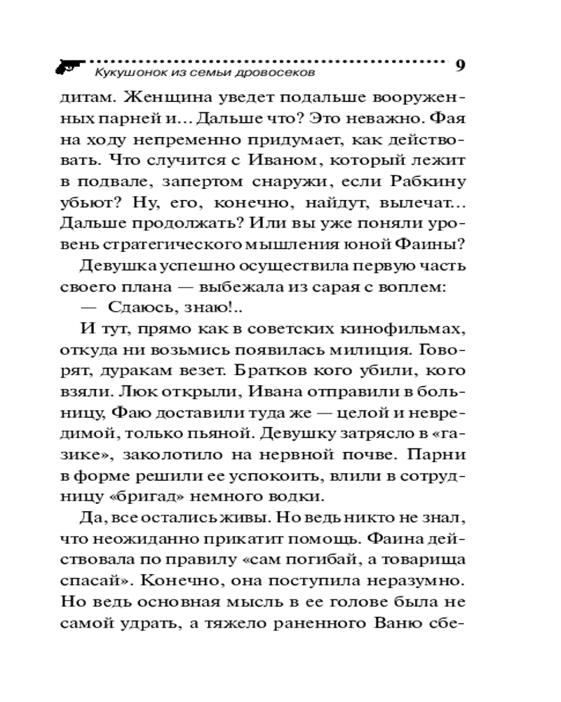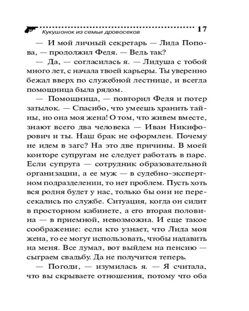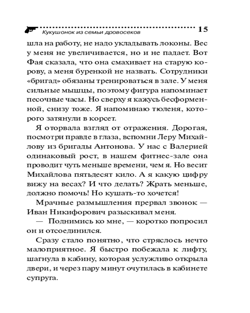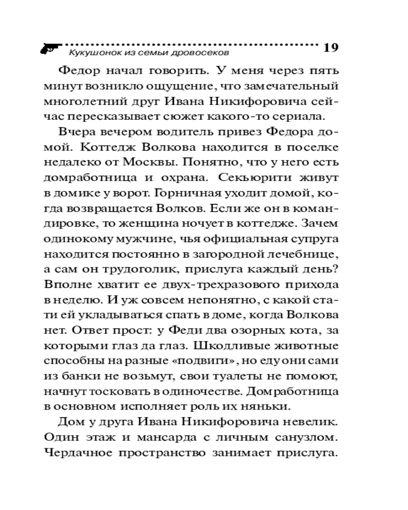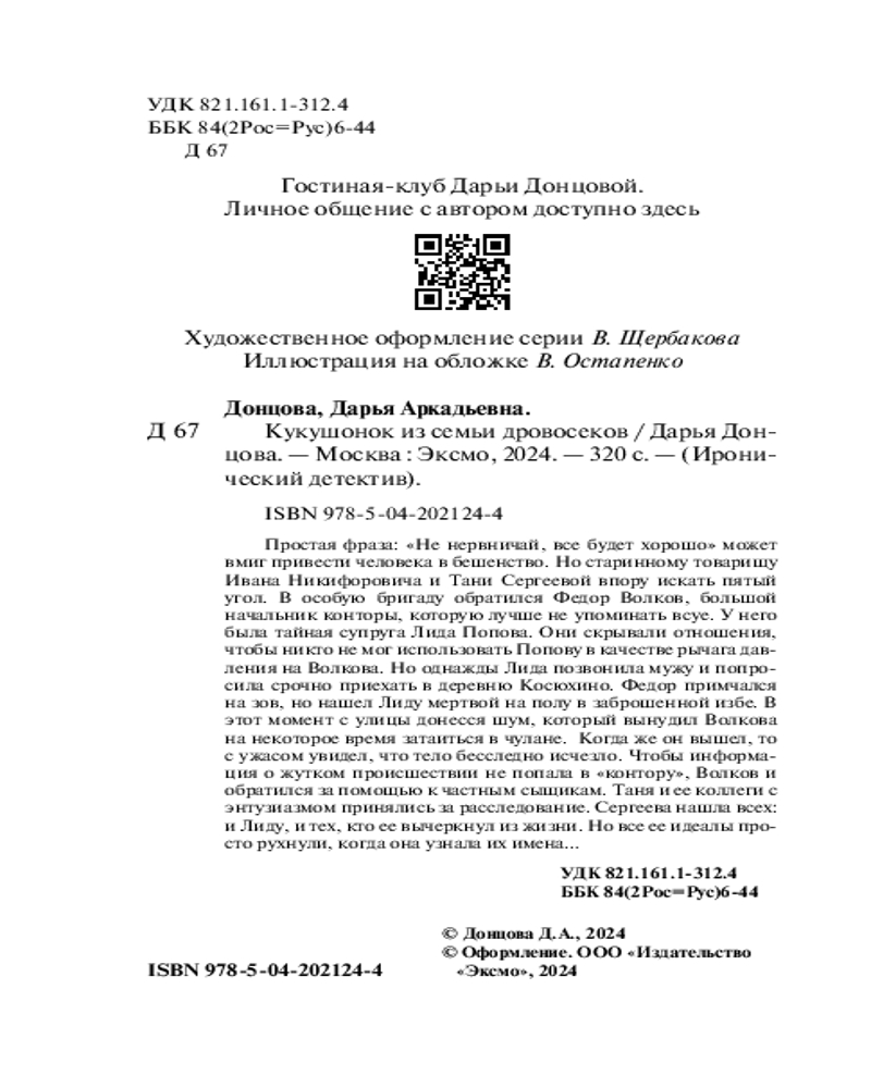 Кукушонок из семьи дровосековВ данный момент этот товар отсутствует в продаже. Возможно, у нас найдется аналогичный или похожий товар здесь. Серия: Иронический детектив (обложка) Простая фраза: «Не нервничай, все будет хорошо» — может вмиг привести человека в бешенство. Но старинному товарищу Ивана Никифоровича и Тани Сергеевой впору искать пятый угол. В особую бригаду обратился Федор Волков, большой начальник конторы, которую лучше не упоминать всуе. У него была тайная супруга Лида Попова. Они скрывали отношения, чтобы никто не мог использовать Попову в качестве рычага давления на Волкова. Но однажды Лида позвонила мужу и попросила срочно приехать в деревню Косюхино. Федор примчался на зов, но нашел Лиду мертвой на полу в заброшенной избе. В этот момент с улицы донесся шум, который вынудил Волкова на некоторое время затаиться в чулане. Когда же он вышел, то с ужасом увидел, что тело бесследно исчезло. Чтобы информация о жутком происшествии попала в «контору», Волков и обратился за помощью к частным сыщикам. Таня и ее коллеги с энтузиазмом принялись за расследование. Сергеева нашла всех: и Лиду, и тех, кто ее вычеркнул из жизни. Но все ее идеалы просто рухнули, когда она узнала их имена... |