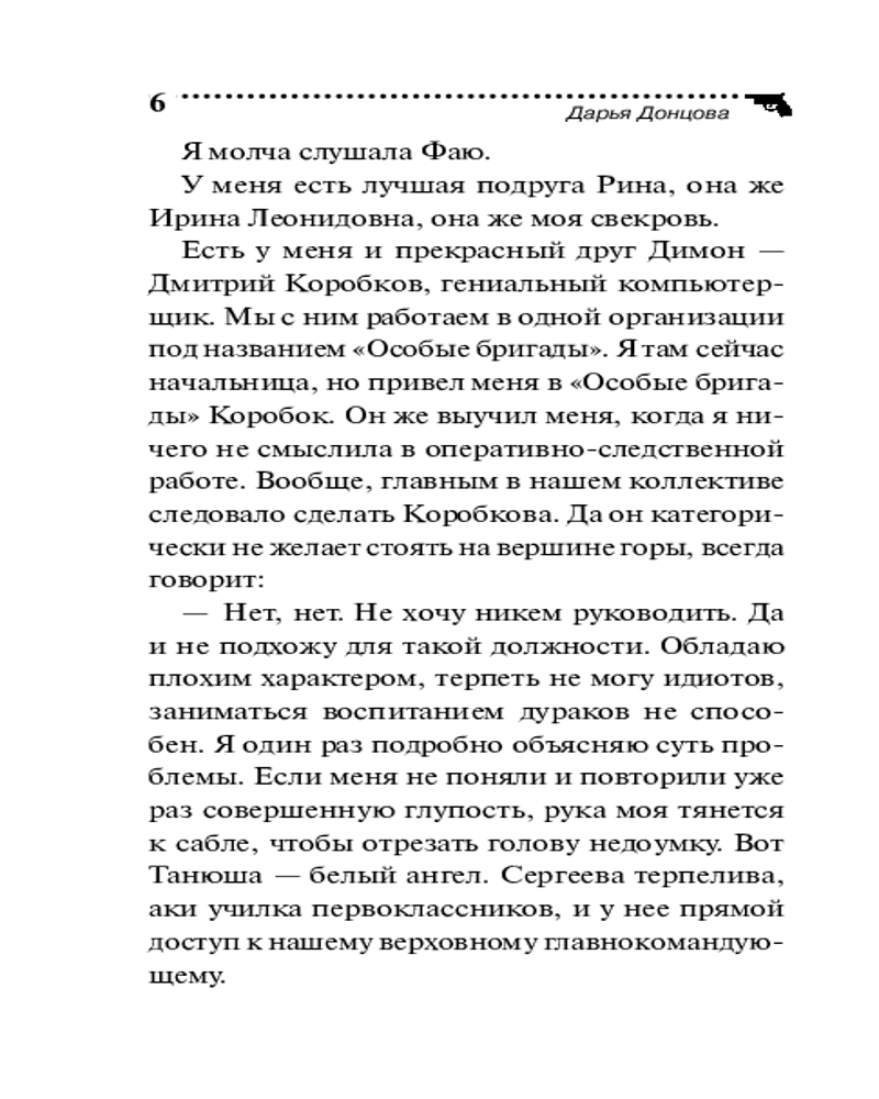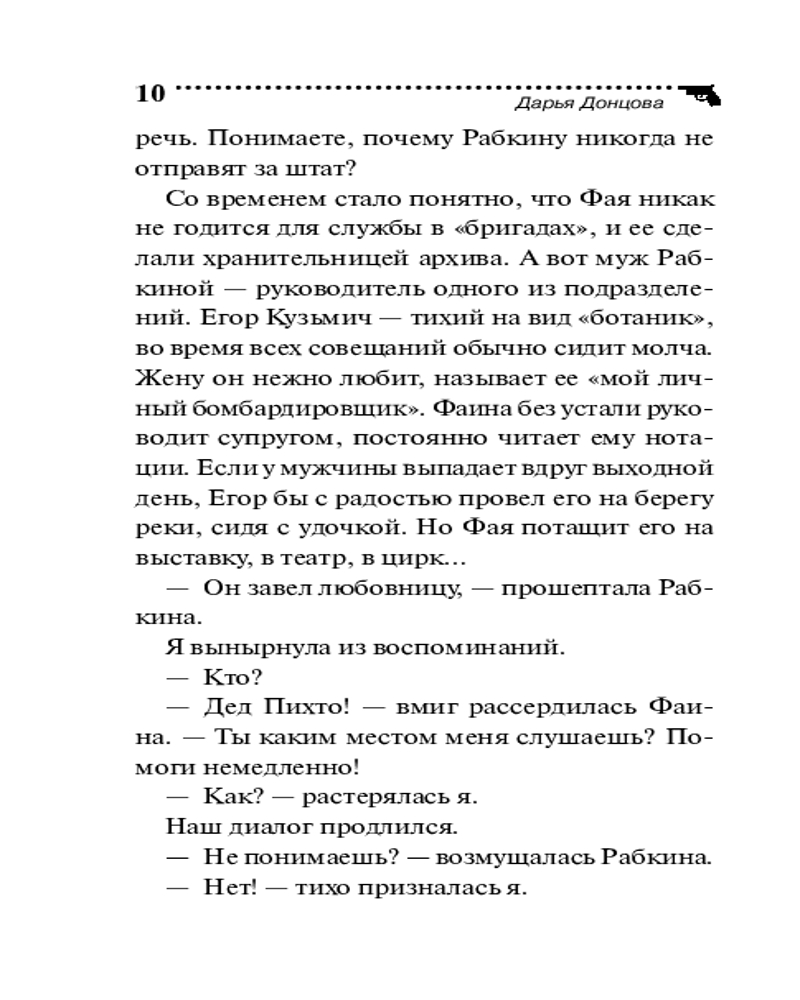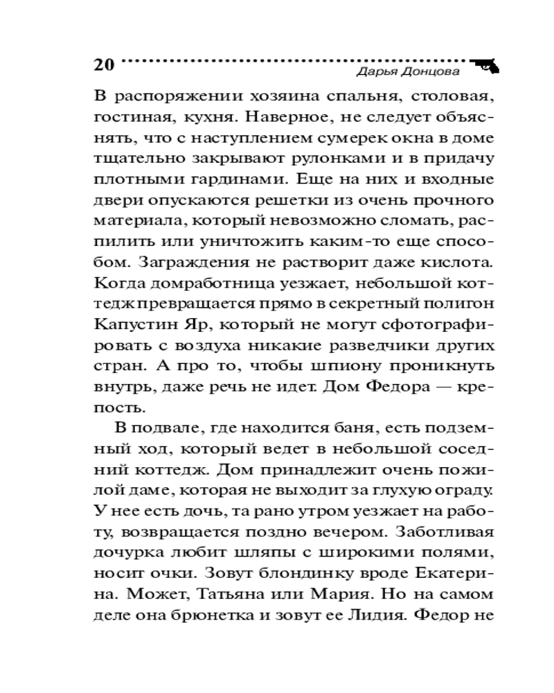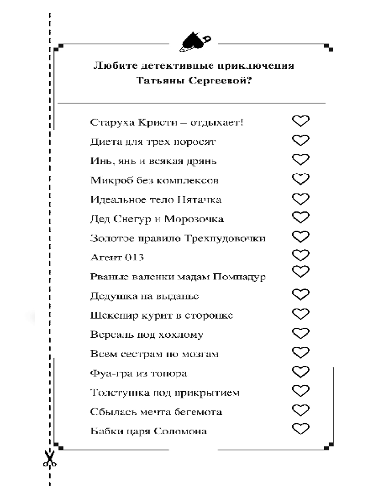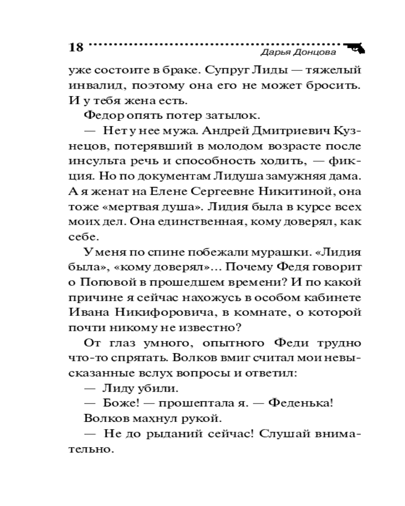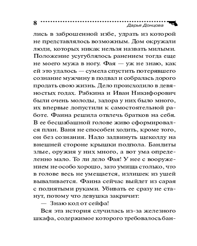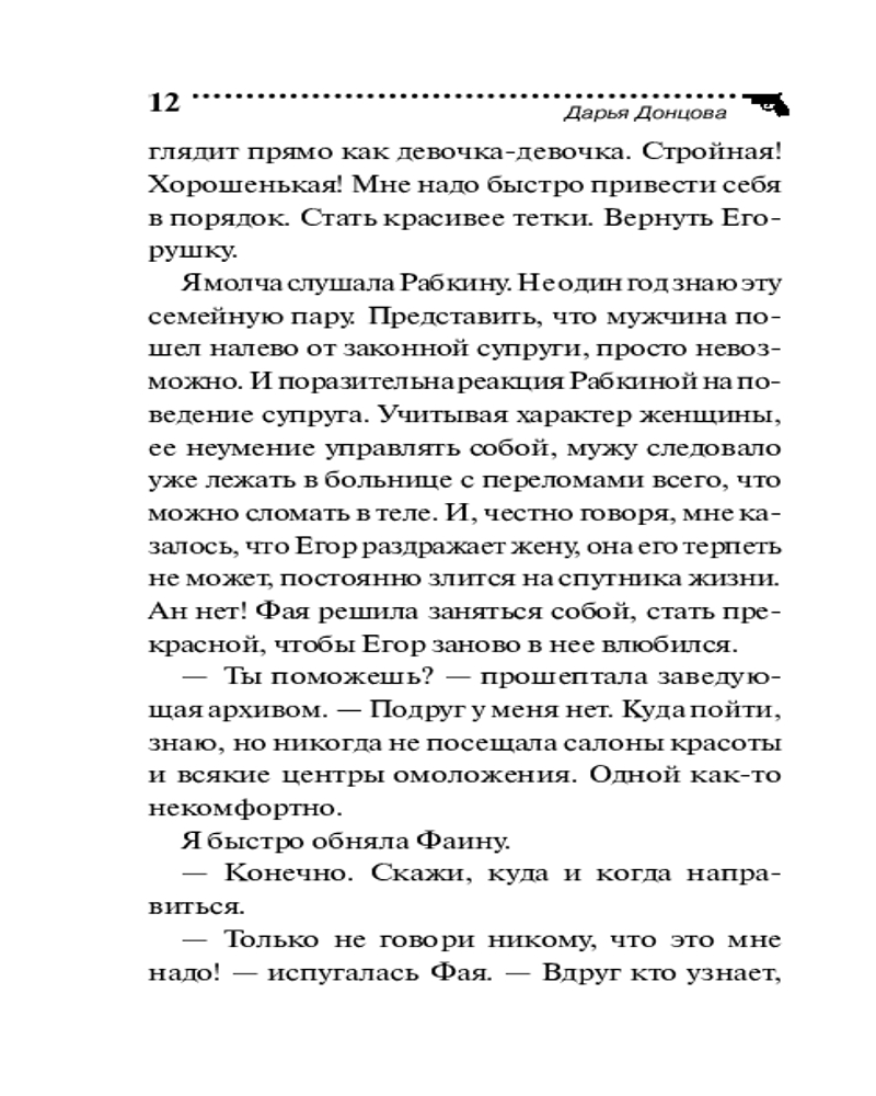 Кукушонок из семьи дровосековВ данный момент этот товар отсутствует в продаже. Возможно, у нас найдется аналогичный или похожий товар здесь. Серия: Иронический детектив (обложка) Простая фраза: «Не нервничай, все будет хорошо» — может вмиг привести человека в бешенство. Но старинному товарищу Ивана Никифоровича и Тани Сергеевой впору искать пятый угол. В особую бригаду обратился Федор Волков, большой начальник конторы, которую лучше не упоминать всуе. У него была тайная супруга Лида Попова. Они скрывали отношения, чтобы никто не мог использовать Попову в качестве рычага давления на Волкова. Но однажды Лида позвонила мужу и попросила срочно приехать в деревню Косюхино. Федор примчался на зов, но нашел Лиду мертвой на полу в заброшенной избе. В этот момент с улицы донесся шум, который вынудил Волкова на некоторое время затаиться в чулане. Когда же он вышел, то с ужасом увидел, что тело бесследно исчезло. Чтобы информация о жутком происшествии попала в «контору», Волков и обратился за помощью к частным сыщикам. Таня и ее коллеги с энтузиазмом принялись за расследование. Сергеева нашла всех: и Лиду, и тех, кто ее вычеркнул из жизни. Но все ее идеалы просто рухнули, когда она узнала их имена... |