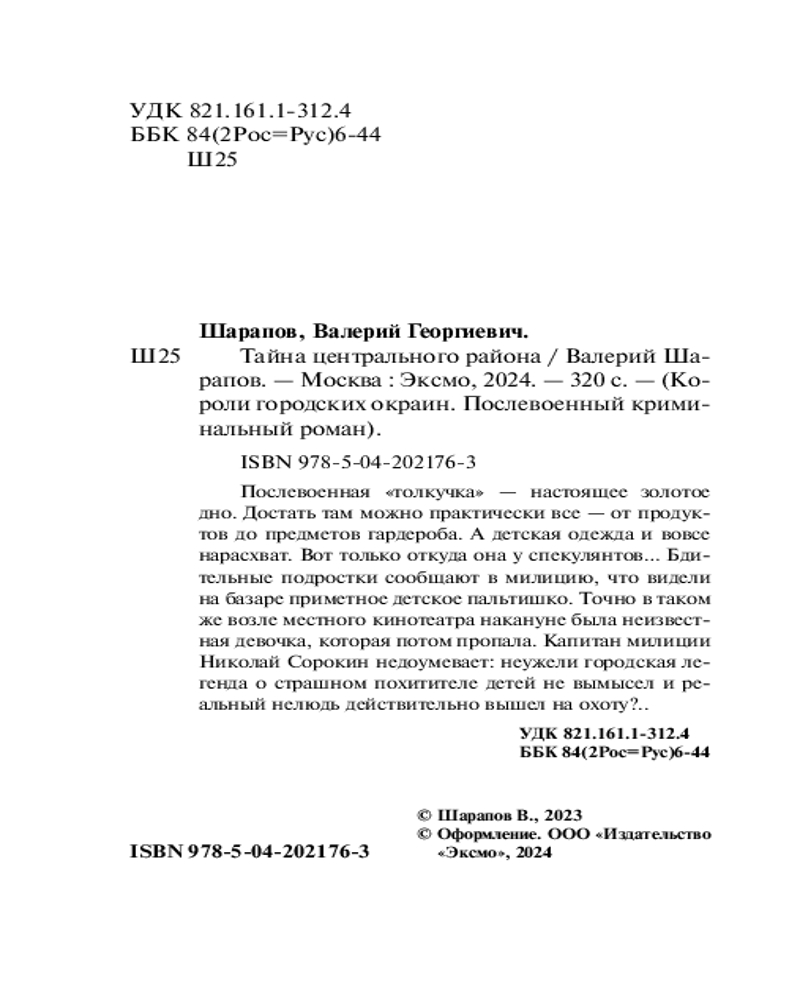 Тайна центрального районаВ данный момент этот товар отсутствует в продаже. Возможно, у нас найдется аналогичный или похожий товар здесь. Серия: Короли городских окраин. Послевоенный криминальный роман (обложка) Послевоенная «толкучка» — настоящее золотое дно. Достать там можно практически все — от продуктов до предметов гардероба. А детская одежда и вовсе нарасхват. Вот только откуда она у спекулянтов... Бдительные подростки сообщают в милицию, что видели на базаре приметное детское пальтишко. Точно в таком же возле местного кинотеатра накануне была неизвестная девочка, которая потом пропала. Капитан милиции Николай Сорокин недоумевает: неужели городская легенда о страшном похитителе детей — не вымысел, и реальный нелюдь действительно вышел на охоту?.. |