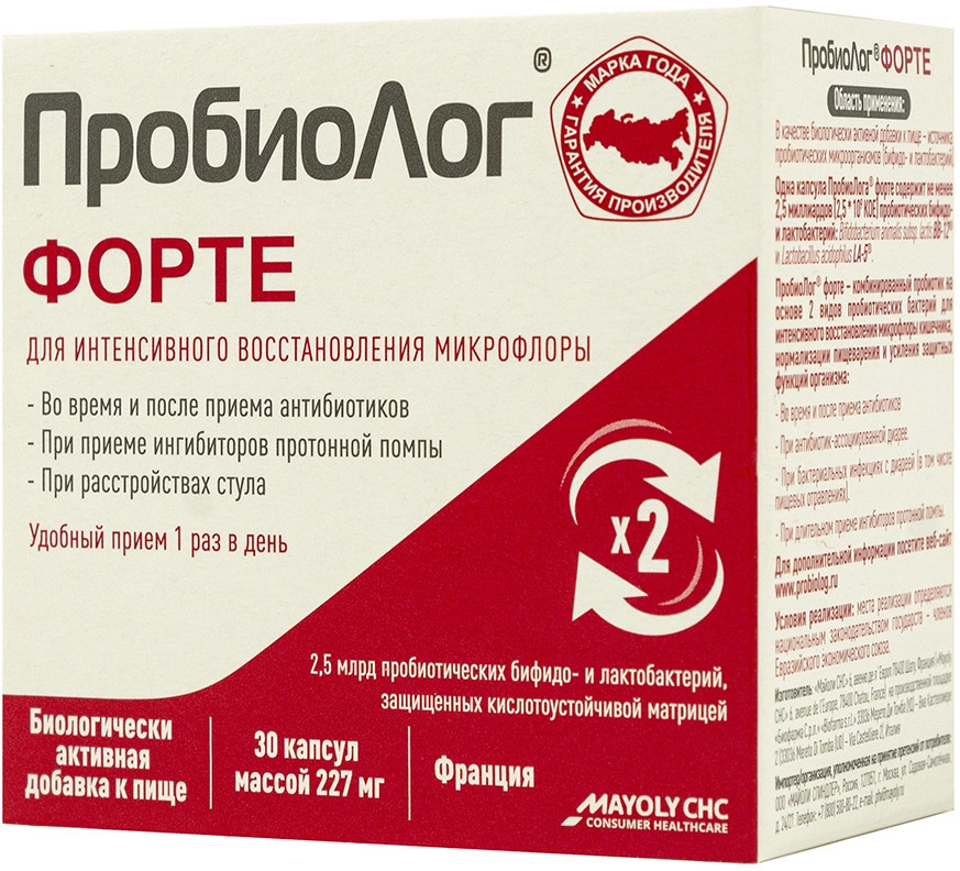 Биологически активная добавка (БАД) к пище — представляет собой пробиотик, сочетающий в себе два вида штаммов бактерий: Lactobacillus acidophilus (ацидофильные лактобактерии) и Bifidobacteгium animalis subs. lactis (бифидобактерии), которые присутствуют в кишечной микрофлоре любого здорового организма и принимают участие в модуляции кишечной проходимости. Пробиотические бактерии могут оказывать положительное влияние на иммунитет. Регулярное применение ПробиоЛог форте позволяет поддерживать естественный баланс кишечной микрофлоры и способствует улучшению кишечной проходимости. ПробиоЛог форте также оказывает благотворное воздействие на процесс пищеварения. Регулярное применение ПробиоЛог форте безопасно для организма, так как он не содержит условно патогенных штаммов. Штаммы живых бактерий LA-5 и ВВ-12 получены с применением технологии микрокапсуляции — уникального процесса производства, при котором бактерии заключены в кислотоустойчивую матрицу. Кислотоустойчивая матрица — полисахаридная оболочка, которая превращается в нерастворимый гель, устойчивый к действию кислоты. Благодаря этому, процент выживаемости бифидо- и лактобактерий согласно исследованию in vitro составляет 73%. Таким образом, капсула и кислотоустойчивая матрица надежно защищают бактерии при прохождении через желудок, обеспечивая жизнеспособность штаммов в тонком и толстом кишечнике. Для обеспечения оптимальных условий хранения препарата при комнатной температуре разработан особый флакон из алюминия или полимерных материалов со специальной крышечкой, ограничивающей газообмен с окружающим воздухом. Уникальный процесс производства капсул и упаковки обеспечивает сохранение жизнеспособности бактерий, что позволяет достичь максимальной эффективности ПробиоЛог форте.