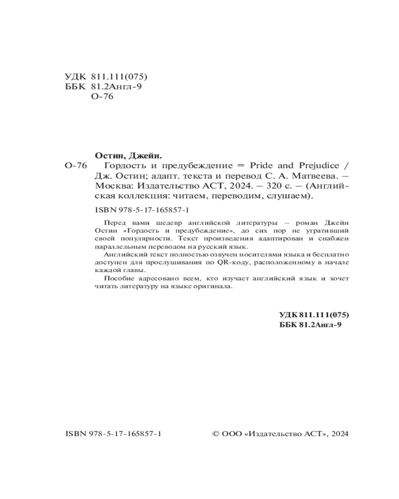 💳 Оплатить за товар можно при получении 🇰🇿 Есть бесплатная доставка по Казахстану от 1 дня 🎁 Копите бонусы с каждой покупки Серия: Английская коллекция: читаем, переводим, слушаем Перед вами шедевр английской литературы — роман Джейн Остин «Гордость и предубеждение», до сих пор не утративший своей популярности. Текст произведения адаптирован и снабжен параллельным переводом на русский язык. Английский текст полностью озвучен носителями языка и бесплатно доступен для прослушивания по QR-коду, расположенному в начале каждой главы. Пособие адресовано всем, кто изучает английский язык и хочет читать литературу на языке оригинала. |