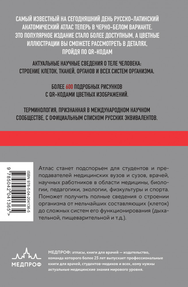 💳 Оплатить за товар можно при получении 🇰🇿 Есть бесплатная доставка по Казахстану от 1 дня 🎁 Копите бонусы с каждой покупки Серия: Медицинский атлас Самый популярный в России русско-латинский атлас анатомии человека с дополненной реальностью. В книге представлены черно-белые изображения из 2-го издания, цветные иллюстрации доступны по QR-кодам рядом с картинками. Данное издание сохранило исчерпывающие научные сведения о теле человека, включая строение клетки, тканей, органов и функциональную анатомию — с учетом последних мировых достижений. Использована самая современная терминология, утвержденная на XV Международном анатомическом конгрессе, с официальным списком русских эквивалентов. Атлас дает доступ к более 1000 анатомическим рисункам. Поможет сдать анатомию студентам медицинских вузов и колледжей, а также будет полезен как справочник преподавателям и научным работникам в области медицины, педагогики, экологии, физкультуры и спорта. Далекие от медицины люди смогут при помощи справочника разобраться в анатомии, чтобы заботиться о своем здоровье и здоровье своих близких. |