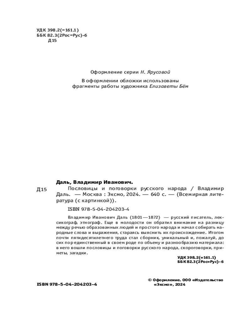 💳 Оплатить за товар можно при получении 🇰🇿 Есть бесплатная доставка по Казахстану от 1 дня 🎁 Копите бонусы с каждой покупки Серия: Всемирная литература (новое оформление) Владимир Иванович Даль (1801-1872) — русский писатель, лексикограф, этнограф. Еще в молодости он обратил внимание на разницу между речью образованных людей и простого народа и начал собирать народные слова и выражения, стараясь выяснить их происхождение. Итогом почти пятидесятилетнего труда стал сборник, уникальный и, пожалуй, до сих пор единственный в своем роде по объему и разнообразию материала: в него вошли пословицы и поговорки русского народа, скороговорки, приметы, загадки. |