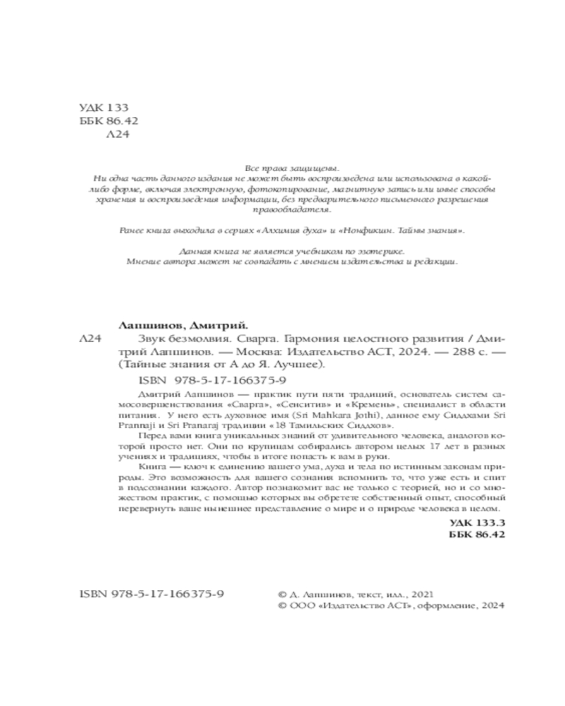💳 Оплатить за товар можно при получении 🇰🇿 Есть бесплатная доставка по Казахстану от 1 дня 🎁 Копите бонусы с каждой покупки Серия: Тайные знания от А до Я. Лучшее Дмитрий Лапшинов — практик пути пяти традиций, основатель систем самосовершенствования «Сварга», «Сенситив» и «Кремень», специалист в области питания. У него есть духовное имя (Sri Mahkara Jothi), данное ему Сиддхами Sri Prannaji и Sri Pranaraj традиции «18 Тамильских Сиддхов». Перед вами книга уникальных знаний от удивительного человека, аналогов которой просто нет. Они по крупицам собирались автором целых 17 лет в разных учениях и традициях, чтобы в итоге попасть к вам в руки. |