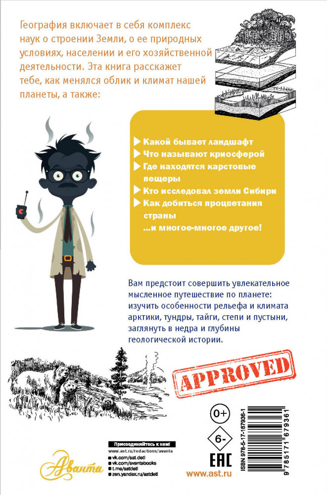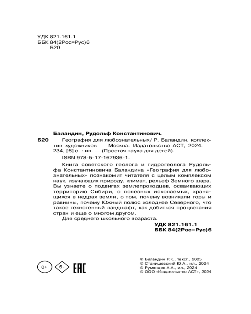 География для любознательныхРудольф Константинович Баландин качество материалы сборка инструкция В данный момент этот товар отсутствует в продаже. Возможно, у нас найдется аналогичный или похожий товар здесь. Серия: Простая наука для детей Книга советского геолога и гидрогеолога Рудольфа Константиновича Баландина «География для любознательных» познакомит читателя с целым комплексом наук, изучающих природу, климат, рельеф Земного шара. Вы узнаете о подвигах землепроходцах, осваивающих территорию Сибири, о полезных ископаемых, хранящихся в недрах земли, о том, почему возникали горы и равнины, почему Южный полюс холоднее Северного, что такое техногенный ландшафт, как добиться процветания своей страны и еще о многом другом. Для среднего школьного возраста. |