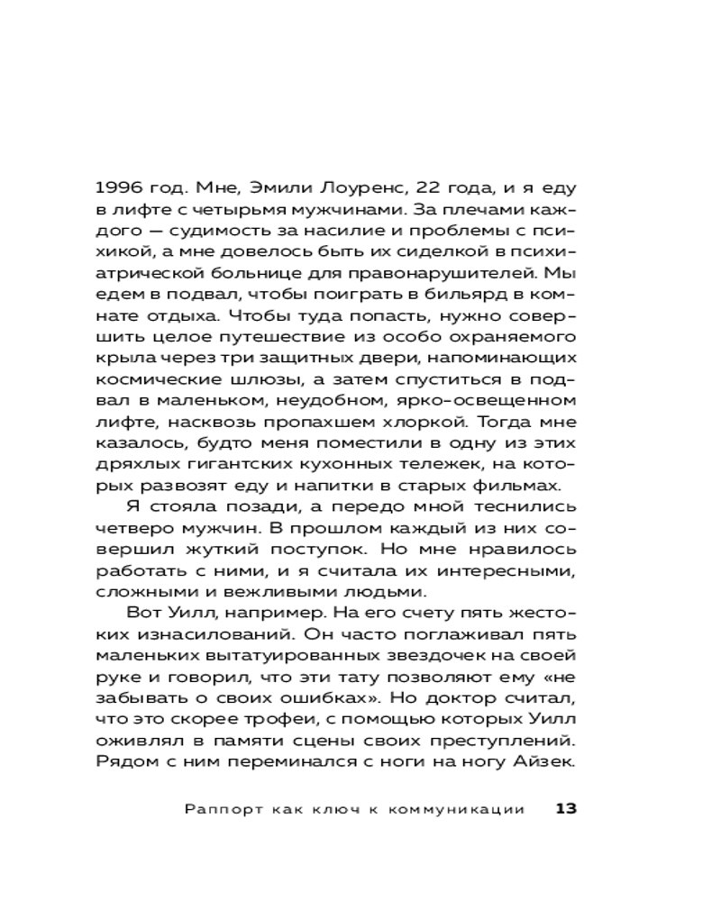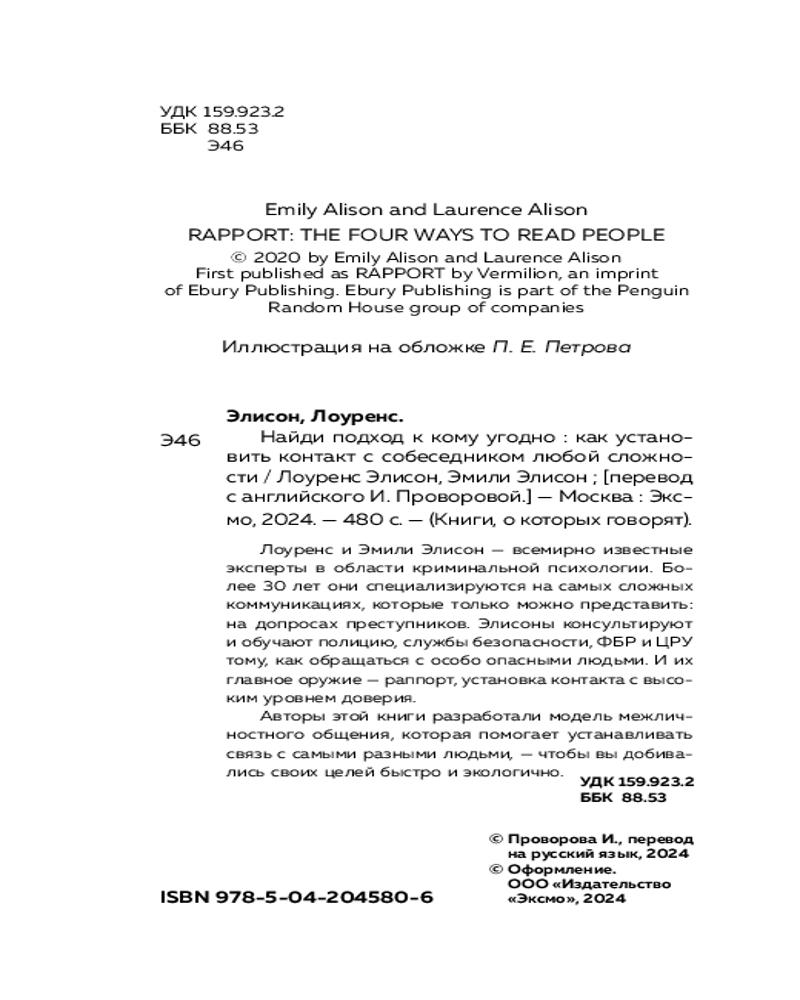 💳 Оплатить за товар можно при получении 🇰🇿 Есть бесплатная доставка по Казахстану от 1 дня 🎁 Копите бонусы с каждой покупки Серия: Книги, о которых говорят Лоуренс и Эмили Элисон — всемирно известные эксперты в области криминальной психологии. Более 30 лет они специализируются на самых сложных коммуникациях, которые только можно представить: на допросах преступников. Элисоны консультируют и обучают полицию, службы безопасности, ФБР и ЦРУ тому, как обращаться с особо опасными людьми. И их главное оружие — раппорт, установка контакта с высоким уровнем доверия. Авторы этой книги разработали модель межличностного общения, которая помогает устанавливать связь с самыми разными людьми,— чтобы вы добивались своих целей быстро и экологично. |