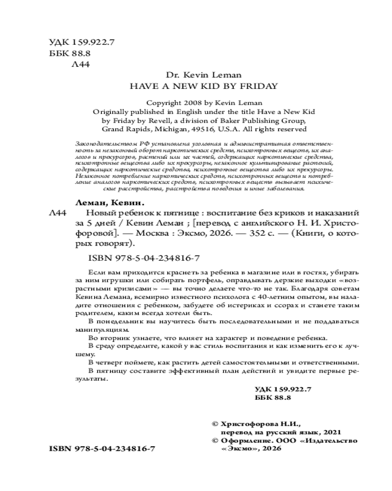 💳 Оплатить за товар можно при получении 🇰🇿 Есть бесплатная доставка по Казахстану от 1 дня 🎁 Копите бонусы с каждой покупки Серия: Книги, о которых говорят Если вам приходится краснеть за ребенка в магазине или в гостях, убирать за ним игрушки или собирать портфель, оправдывать дерзкие выходки «возрастными кризисами» — вы точно делаете что-то не так. Благодаря советам Кевина Лемана, всемирно известного психолога с 40-летним опытом, вы наладите отношения с ребенком, забудете об истериках и ссорах и станете таким родителем, каким всегда хотели быть. В понедельник вы научитесь быть последовательными и не поддаваться манипуляциям. Во вторник узнаете, что влияет на характер и поведение ребенка. В среду определите, какой у вас стиль воспитания и как изменить его к лучшему. В четверг поймете, как растить детей самостоятельными и ответственными. В пятницу составите эффективный план действий и увидите первые результаты. |