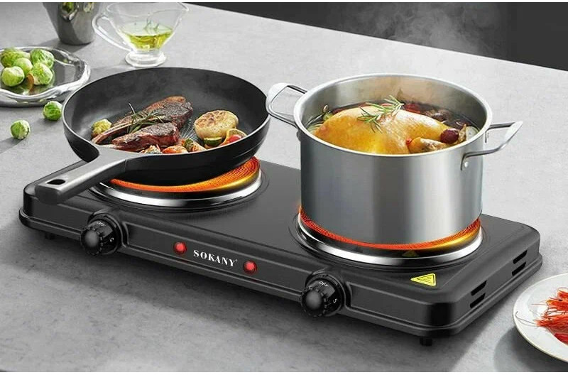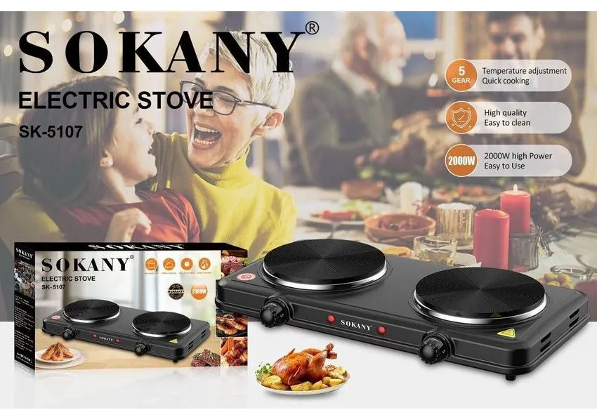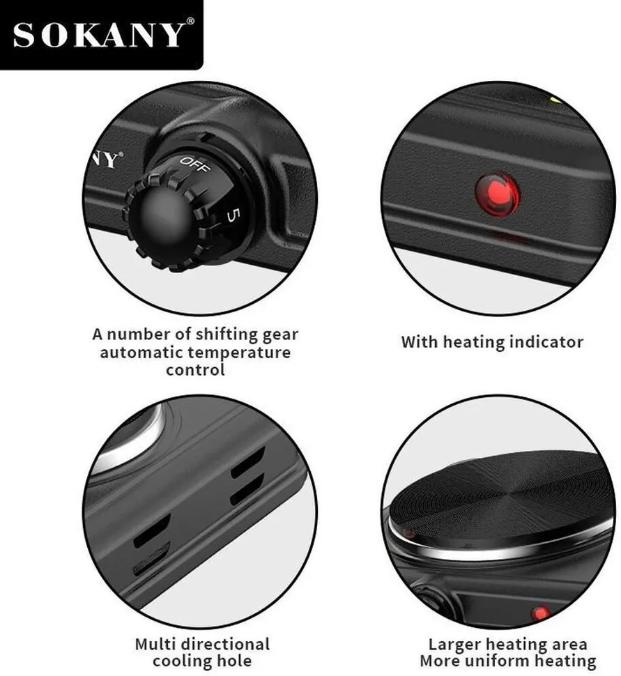 Sokany Плита настольная плита SK-5107В данный момент этот товар отсутствует в продаже. Возможно, у нас найдется аналогичный или похожий товар здесь. Настольная электрическая плита Sokany SK-5107 идеально подойдет как для городской квартиры, так и для загородного дома. Плита электрическая имеет 5 температурных режимов, что дает возможность регулировать температуру при приготовлении любимых блюд. Это компактный прибор для приготовления и разогрева пищи. Две чугунные конфорки диаметром 155 мм. Благодаря чугунной поверхности, тепло распределяется равномерно. Плитка подходит для всех типов посуды - алюминий, эмаль, керамика, металл, чугун, антипригарное покрытие. Прорезиненные ножки не позволят плитке скользить по столу. Мощность плитки — 2000 Вт. Мощность каждой конфорки — 1000 Вт. Имеется световой индикатор работы для каждой конфорки, благодаря которой вы всегда видите, что конфорки работают. Плита обладает низкой тепловой инерцией и очень экономична в эксплуатации. |
