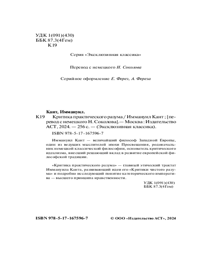 💳 Оплатить за товар можно при получении 🇰🇿 Есть бесплатная доставка по Казахстану от 1 дня 🎁 Копите бонусы с каждой покупки Серия: Эксклюзивная классика (Лучшее) Иммануил Кант — величайший философ Западной Европы, один из ведущих мыслителей эпохи Просвещения, родоначальник немецкой классической философии, основатель критического идеализма, внесший решающий вклад в развитие европейской философской традиции. «Критика практического разума» — главный этический трактат Иммануила Канта, развивающий идеи его «Критики чистого разума» и подробно исследующий понятие категорического императива — высшего принципа нравственности. |