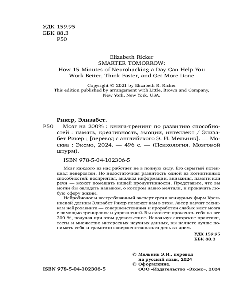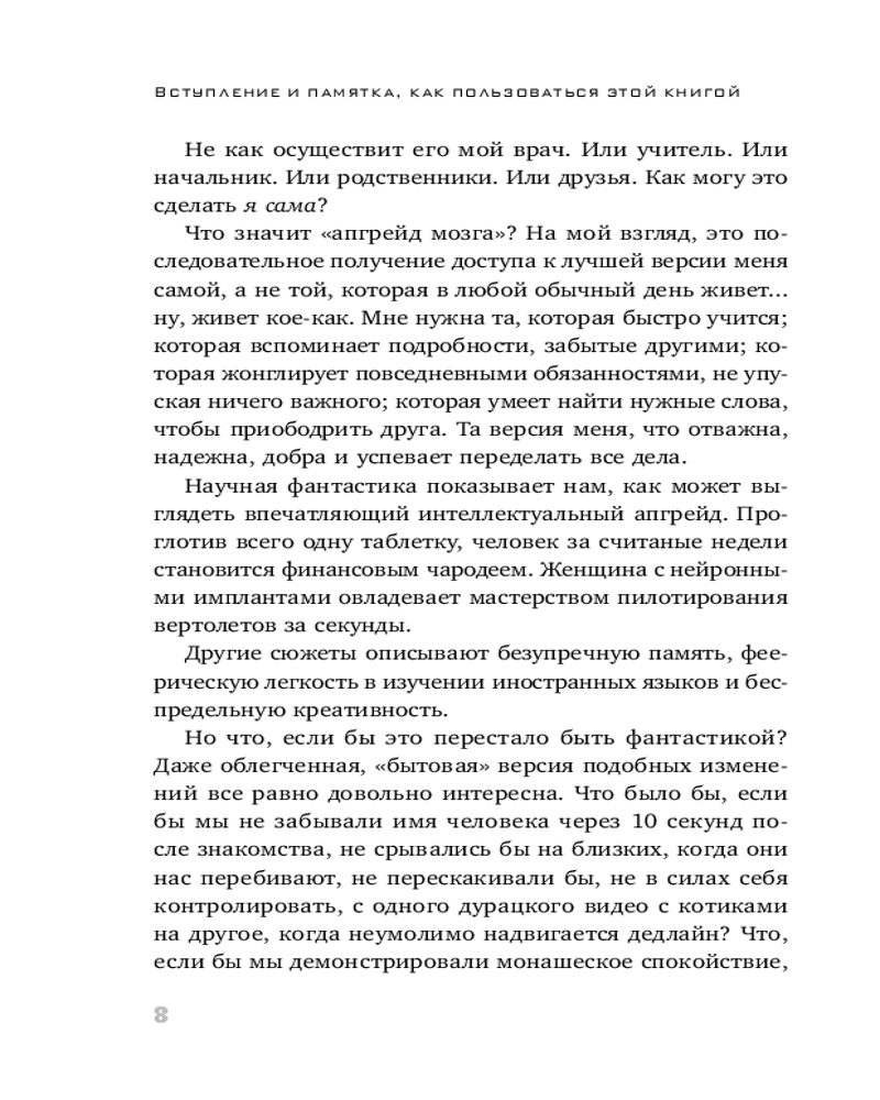 💳 Оплатить за товар можно при получении 🇰🇿 Есть бесплатная доставка по Казахстану от 1 дня 🎁 Копите бонусы с каждой покупки Серия: Психология. Мозговой штурм Неправильный образ жизни, стресс, отсутствие физической активности и несбалансированное питание негативно влияют на продуктивность мозга. Нейробиолог и востребованный эксперт среди венчурных фирм Кремниевой долины Элизабет Рикер разработала эффективную программу нейрохакинга, которая поможет проработать слабые места (память, быстрое решение задач, написание текстов, публичные выступления и многое другое). Начать автор предлагает с оценки здоровья, уровня физической активности и удовлетворенности собственной жизнью, что сориентирует вас и поможет проложить увлекательный путь к повышению продуктивности мозга. |