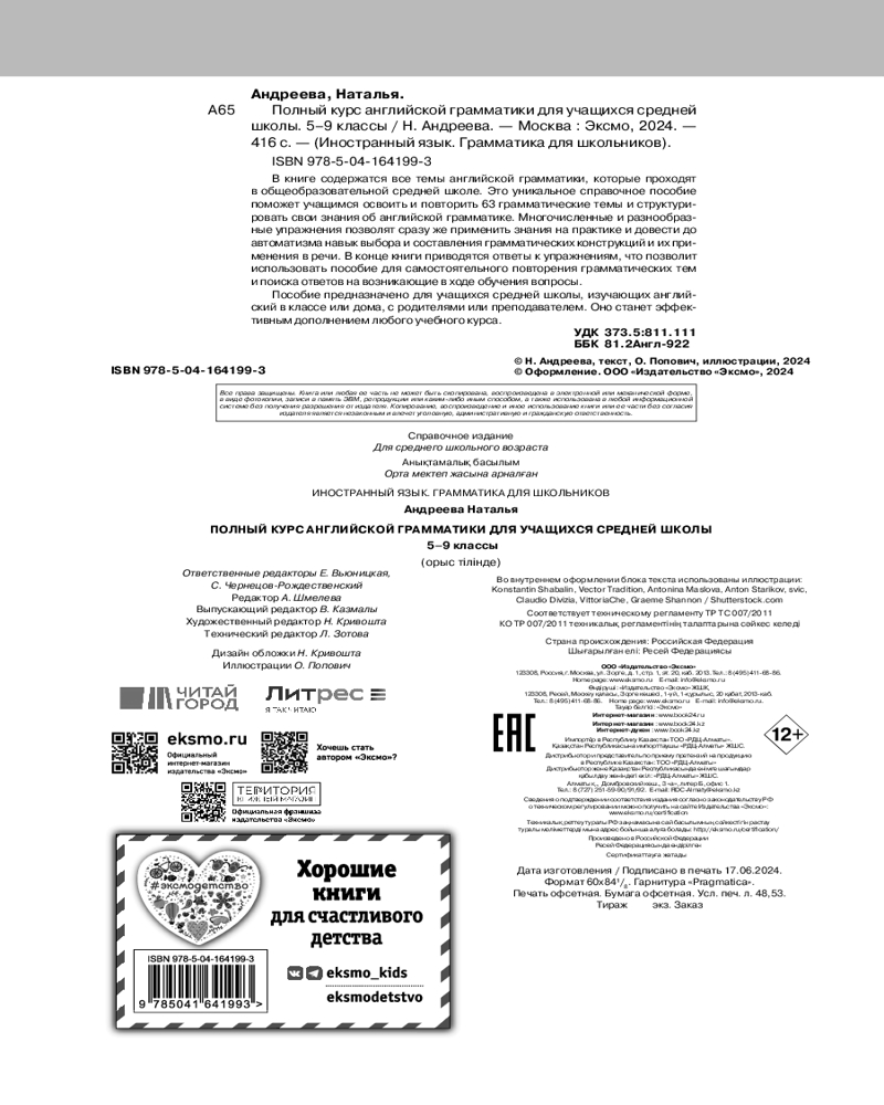 💳 Оплатить за товар можно при получении 🇰🇿 Есть бесплатная доставка по Казахстану от 1 дня 🎁 Копите бонусы с каждой покупки Серия: Иностранный язык. Грамматика для школьников По какому бы учебнику ни занимался ваш школьник, это справочное пособие поможет ему найти ответы на все возникающие вопросы об английской грамматике! В каждой теме вас ждут понятные объяснения с примерами, а затем — множество упражнений для практики, от простых к более сложным. Благодаря множеству разнообразных заданий с этой книгой легко научиться быстро и уверенно выбирать грамматические формы, не путаться в их составлении и непринужденно применять их в речи! В конце пособия — ответы к упражнениям! Продолжайте изучать английский и радуйтесь новым успехам! |