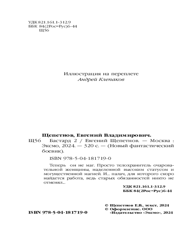 💳 Оплатить за товар можно при получении 🇰🇿 Есть бесплатная доставка по Казахстану 🎁 Копите бонусы с каждой покупки Серия: Новый фантастический боевик. Миры Евгения Щепетнова Теперь он не маг. Просто телохранитель очаровательной женщины, наделенной высоким статусом и могущественной магией. И... палач для которого скоро найдется работа, ведь старых обязанностей никто не отменял. Телохранитель и любовник прелестной магички Содин, бастард Эдвин Дер Дасен теряет в битве свои магические способности и теперь противостоит тем, кто хочет использовать его в своих интересах. |