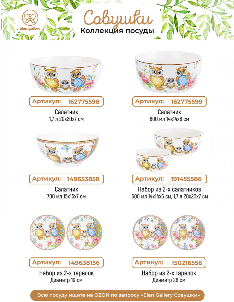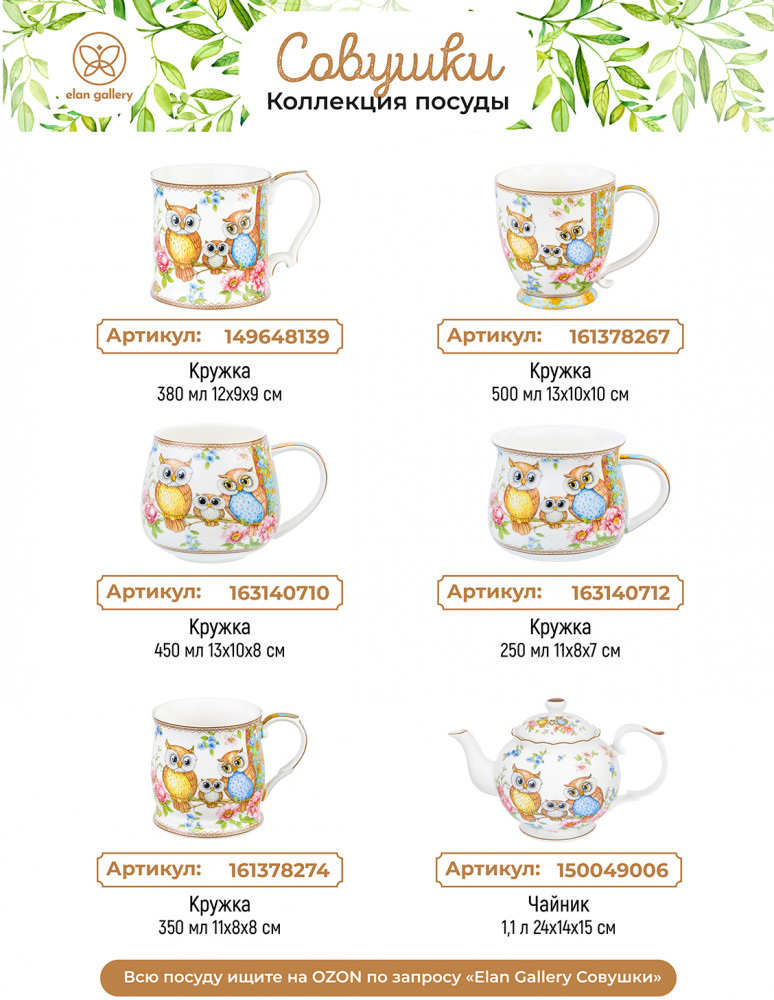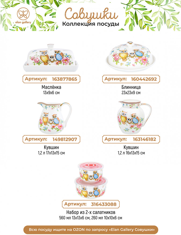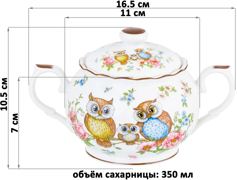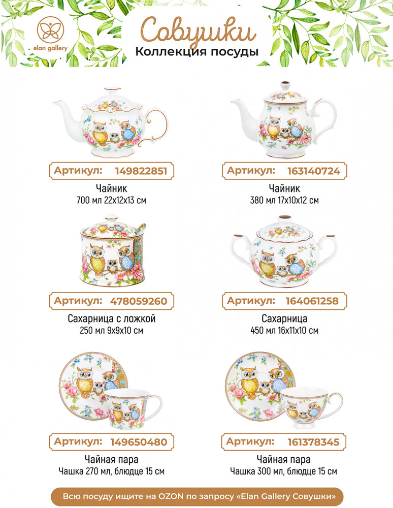 Elan Gallery Набор чайный «Совушки»В данный момент этот товар отсутствует в продаже. Возможно, у нас найдется аналогичный или похожий товар здесь. Серия: Совушки Набор Elan Gallery «Совушки» выполнена из белого фарфора и украшена рисунком с милыми совами и совёнком. Фарфоровый чайничек подходит для заваривания чая каждый день и станет незаменимым предметом для организации чаепития. Подойдёт для любых горячих напитков. Оснащен фильтром в виде маленьких отверстий в стеночке, благодаря которому вы сможете наслаждаться ароматной заваркой без попадания мелких чаинок. На крышке с обратной стороны есть выступ, чтобы она хорошо держалась на чайнике. Аккуратные кружечки с блюдцами подходят ценителям чая и кофе, которые любят пить из красивой и необычной посуды. Интересные чашки украсят ваш стол своим стильным дизайном как на праздник, так и в будни. Используйте сервировочное блюдо как подставку для чашки, чтобы порадовать гостей изящной сервировкой. Положите на блюдце кусочек торта, домашнего пирога или пирожное. Небольшая тарелочка подойдёт не только для десерта, но и закусок: сырной нарезки, колбасы или овощей и зелени. Разместите на ней кусочки шашлыка или бутерброды, чтобы перекусить за чашечкой кофе. Сахарницу можно использовать не только для хранения сахара, но и как баночку для мёда, варенья или джема. Подойдёт для изящной сервировки икры. Декоративная баночка с крышкой станет гармоничным дополнением вашего стола как в будни, так и на праздник. Ёмкость с крышечкой можно использовать не только под сладости, но и для специй, приправ и соли. Фарфоровая посуда отличается от керамики повышенной плотностью. Фарфор не впитывает цвет продуктов и не деформируется от влаги, чему может быть подвержена керамическая посуда. Не рекомендуется применять абразивные моющие средства. Можно использовать в СВЧ и ПММ. Поставляется в красивой подарочной упаковке. Набор станет украшением вашей кухни или приятным подарком для близких. |