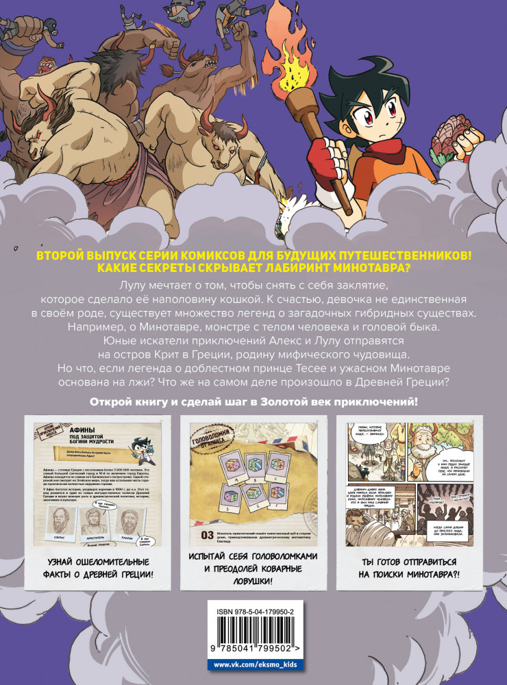 💳 Оплатить за товар можно при получении 🇰🇿 Есть бесплатная доставка по Казахстану 🎁 Копите бонусы с каждой покупки Серия: X-Venture. Комиксы для ума и настроения По совету своей новой напарницы, Лулу, Алекс отправляется в Грецию, мифология которой столь многогранна. Здесь он встречает группировку искателей сокровищ «Фиолетовый дым», которая шумно празднует находку настоящих, как они утверждают, останков Минотавра. Следуя древней легенде о лабиринте и чутью, Алекс с Лулу оказываются на острове Крит. Они обнаруживают, что многие исторически ценные сооружения попросту разрушены: здесь члены «Фиолетового дыма» нашли скелет. Алексу во что бы то ни стало нужно понять, какой секрет таится в лесах Крита, и защитить его от алчных людей. Правда, к которой приведут поиски, шокирует не только героев, но и вас... Узнайте альтернативную концовку мифа о подвиге Тесея, помогите разгадать головоломки, спрятанные на острове, и познакомьтесь с культурой и историей Древней Греции. |