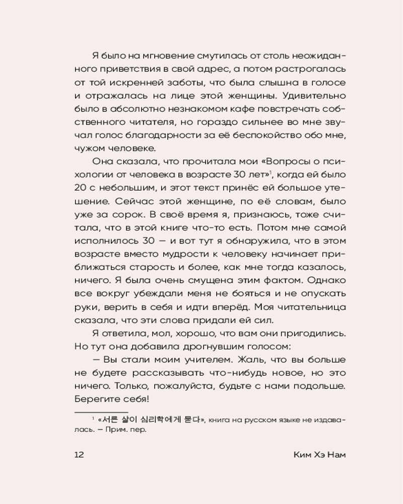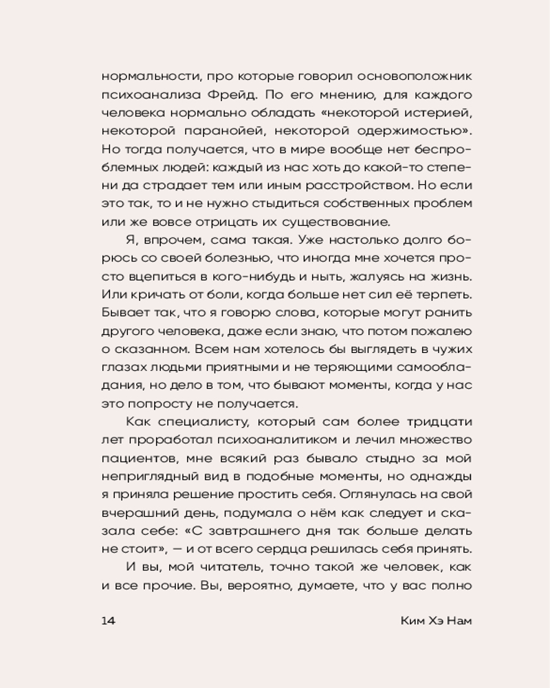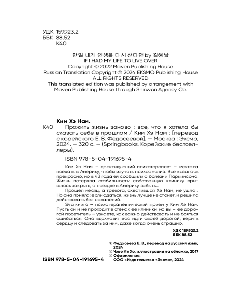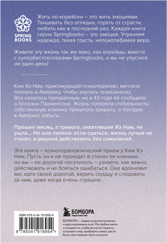 💳 Оплатить за товар можно при получении 🇰🇿 Есть бесплатная доставка по Казахстану от 1 дня 🎁 Копите бонусы с каждой покупки Серия: Springbooks. Корейские бестселлеры Ким Хэ Нам — практикующий психотерапевт — мечтала поехать в Америку, чтобы изучать психоанализ. Все казалось прекрасно, но в 43 года ей сообщили о болезни Паркинсона. Жизнь потеряла стабильность: собственную клинику пришлось закрыть, о поездке в Америку забыть... Прошел месяц, а тревога, охватившая Хэ Нам, не ушла... Но она поняла — если сдаться, жизнь лучше не станет, и решила действовать без сожалений. |