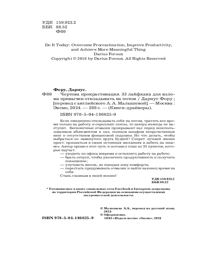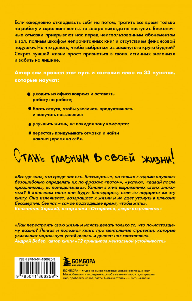 💳 Оплатить за товар можно при получении 🇰🇿 Есть бесплатная доставка по Казахстану от 1 дня 🎁 Копите бонусы с каждой покупки Серия: Книги-драйверы Если ежедневно откладывать себя на потом, тратить все время только на работу и скроллинг ленты, то завтра никогда не наступит. Бесконечные отмазки прикрывают нас перед неиспользованным абонементом в зал, полным шкафом непрочитанных книг и отсутствием финансовой подушки. Но что делать, чтобы выбраться из замкнутого круга будней? Секрет лучшей жизни прост: признаться в своих истинных желаниях и забить на лишнее. |