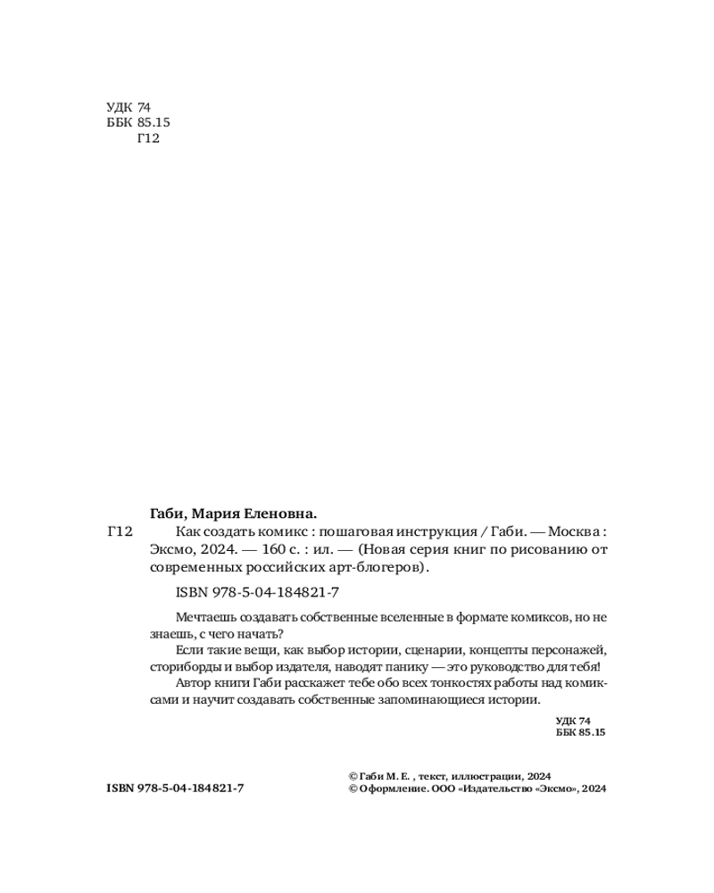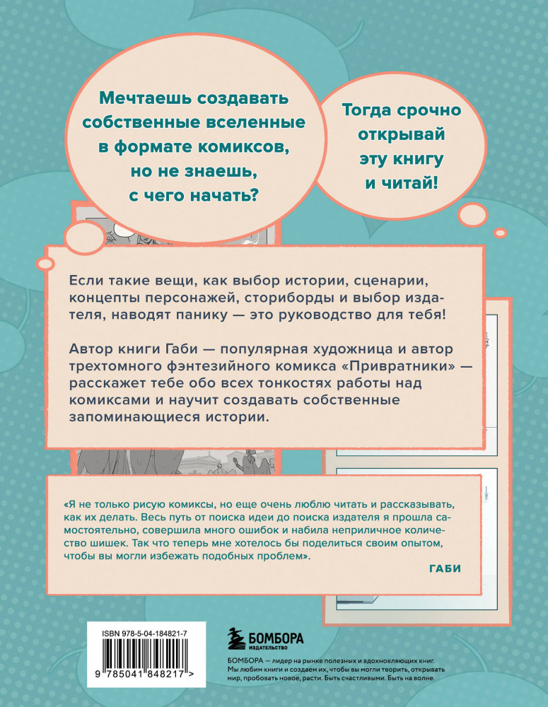 💳 Оплатить за товар можно при получении 🇰🇿 Есть бесплатная доставка по Казахстану 🎁 Копите бонусы с каждой покупки Серия: Рисуем с любимыми художниками. Авторские приемы и техники Мечтаешь создавать собственные вселенные в формате комиксов, но не знаешь, с чего начать? Если такие вещи, как выбор истории, сценарии, концепты персонажей, сториборды и выбор издателя, наводят панику — это руководство для тебя! Автор книги Габи расскажет тебе обо всех тонкостях работы над комиксами и научит создавать собственные запоминающиеся истории. Габи — популярная художница и автор трехтомного фэнтезийного комикса «Привратники». |