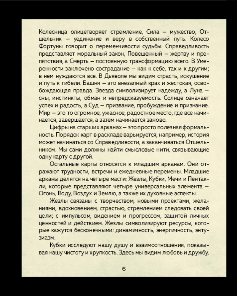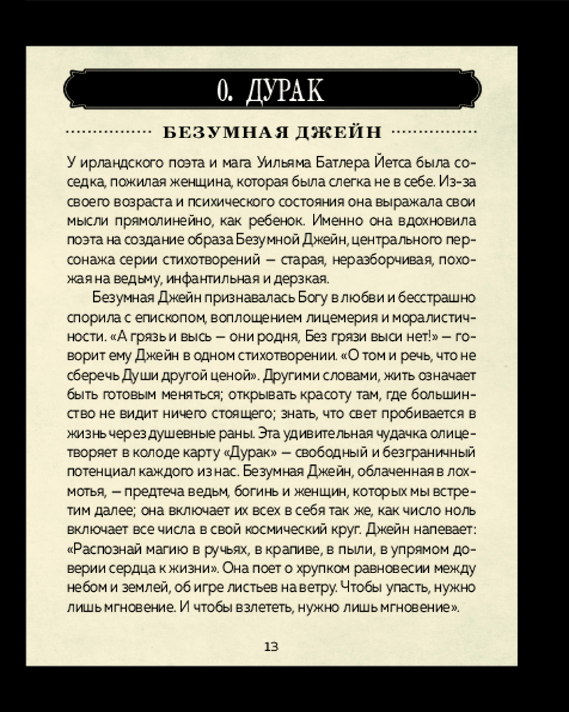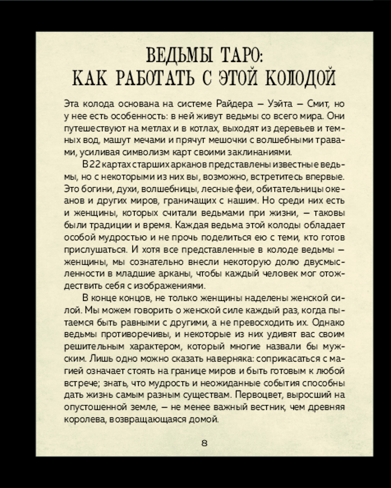 💳 Оплатить за товар можно при получении 🇰🇿 Есть бесплатная доставка по Казахстану от 1 дня 🎁 Копите бонусы с каждой покупки Серия: Карты для гаданий. Таро Колода Таро для тех, кому нужен совет от самых могущественных ведьм всех времен и народов. Безумные старухи, древние фэйри, создания Ночи, повелительницы хаоса, властители судеб и бесстрашные исследовательницы примерили на себя архетипы Старших арканов, чтобы помочь ответить на любой ваш вопрос. Оригинальный гротескный стиль иллюстратора и карикатуриста Симоне Пасе органично сочетается с классической традицией Таро Уэйта, что позволяет работать с колодой даже начинающим тарологам. Эта колода придется по вкусу тем, кто устал от излишнего пафоса, ценит иронию и ищет новых впечатлений. Полноцветное руководство Франчески Маттеони содержит описание каждой карты и ее сюжета, а также позитивные и негативные толкования арканов. В конце руководства содержатся послания-ключи для каждой карты, краткие рекомендации по работе с колодой и простые расклады. |