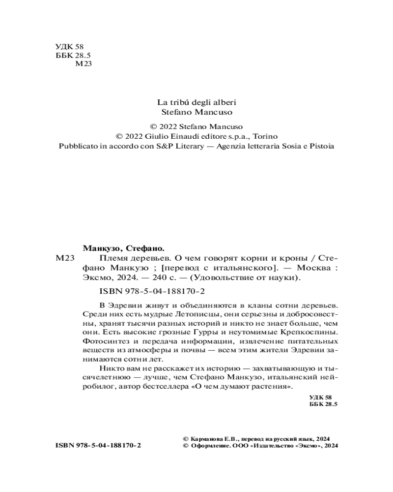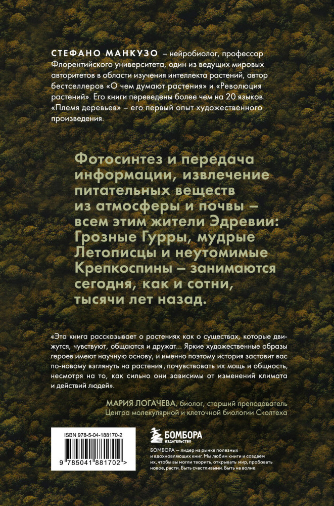 💳 Оплатить за товар можно при получении 🇰🇿 Есть бесплатная доставка по Казахстану от 1 дня 🎁 Копите бонусы с каждой покупки Серия: Удовольствие от науки «Племя деревьев» — история захватывающая и авантюрная, яркая и тысячелетняя. Стефано Манкузо — нейробиолог, профессор флорентийского университета, один из ведущих мировых авторитетов в области изучения интеллекта растений, автор бестселлеров «О чем думают растения» и «Революция растений». Его книги переведены более чем на 20 языков. «Племя деревьев» — его первый опыт художественного произведения. |
