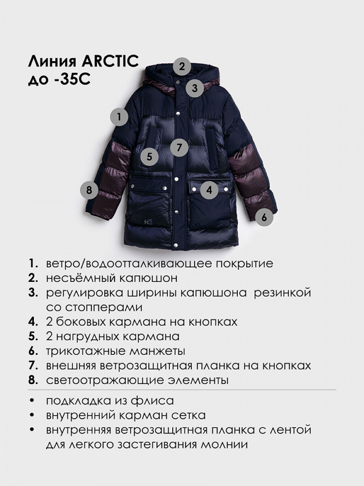 Утепленное зимнее пальто для мальчика-подростка. Линия Arctic — высокая степень теплозащиты. Температурный режим до -35°С. Модная подростковая куртка с ветрозащитным и водоотталкивающим покрытием. Теплая и мягкая флисовая подкладка. Внутренняя ветрозащитная планка с дополнительной лентой для легкого застегивания молнии. Внешняя ветрозащитная планка на кнопках. Эластичные трикотажные манжеты. Два нагрудных кармана на липучках. Два боковых кармана на кнопках. Внутренний карман-сетка. Текстильный клапан для защиты подбородка при застегивании молнии. Несъемный капюшон с возможностью регулировки стопперами. Светоотражающие элементы. Пальто (зима) будет актуально в школу, а также для повседневных прогулок.