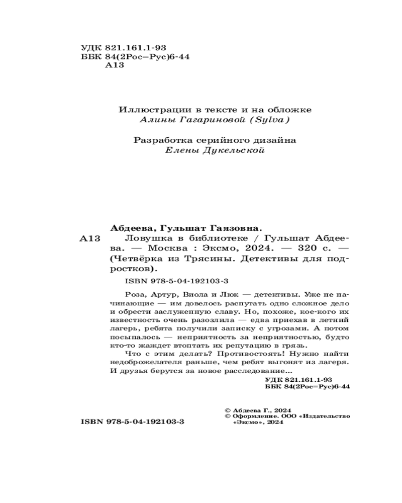💳 Оплатить за товар можно при получении 🇰🇿 Есть бесплатная доставка по Казахстану от 1 дня 🎁 Копите бонусы с каждой покупки Серия: Четвёрка из Трясины. Детективы для подростков Детектив для подростков в духе «Очень странных дел» и «Нэнси Дрю» от известного автора Гульшат Абдеевой! Они не просто друзья, а друзья-детективы! И загадки не оставляют их даже на отдыхе. Только Роза, Артур, Виола и Люк приехали в летний лагерь, как им подбросили записку с угрозами. А когда случилось загадочное происшествие, в нём обвинили ребят! Друзья тут совершенно ни при чём, но кто-то раз за разом подбрасывает улики, которые указывают прямо на них. Это вызов! Четвёрка детективов берётся за дело. |