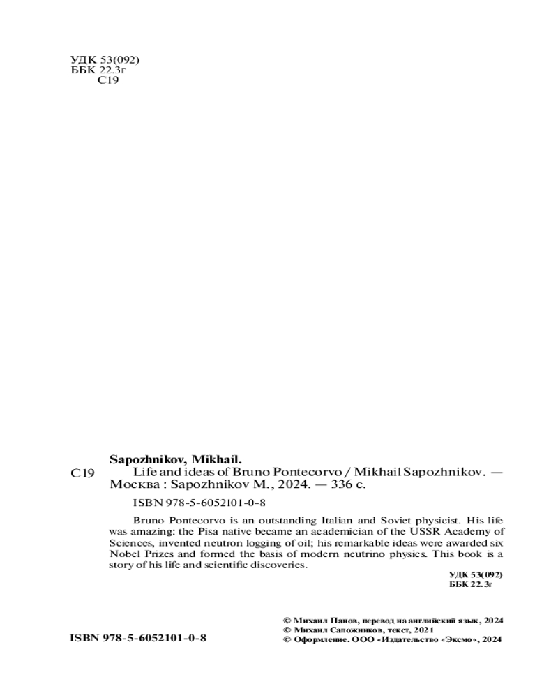💳 Оплатить за товар можно при получении 🇰🇿 Есть бесплатная доставка по Казахстану от 1 дня 🎁 Копите бонусы с каждой покупки Серия: Мастера прозы Bruno Pontecorvo is an outstanding Italian and Soviet physicist. His life is amazing: he was born in Pisa, graduated from the University of Rome, worked together with Enrico Fermi and Joliot-Curie. During World War II he emigrated to the United States, where he worked for an oil company and invented the neutron oil logging method. Pontecorvo was involved in the English atomic project Tube Alloys and when he and his wife and three children suddenly emigrated to the USSR in 1950, suspicions of espionage were immediately aroused. Especially since for the next five years no one knew where Pontecorvo was or what he was doing. The book contains archival documents showing that all these years Pontecorvo was busy with research in the field of particle physics and had nothing to do with Soviet atomic spies or the creation of the atomic bomb in the USSR. Pontecorvo’s remarkable ideas formed the basis of modern neutrino physics, and were the basis for today’s extensive programme of research on neutrino physics. Six Nobel Prizes were awarded for experimental verification of Pontecorvo’s ideas. This book is an account of his life and scientific discoveries. |