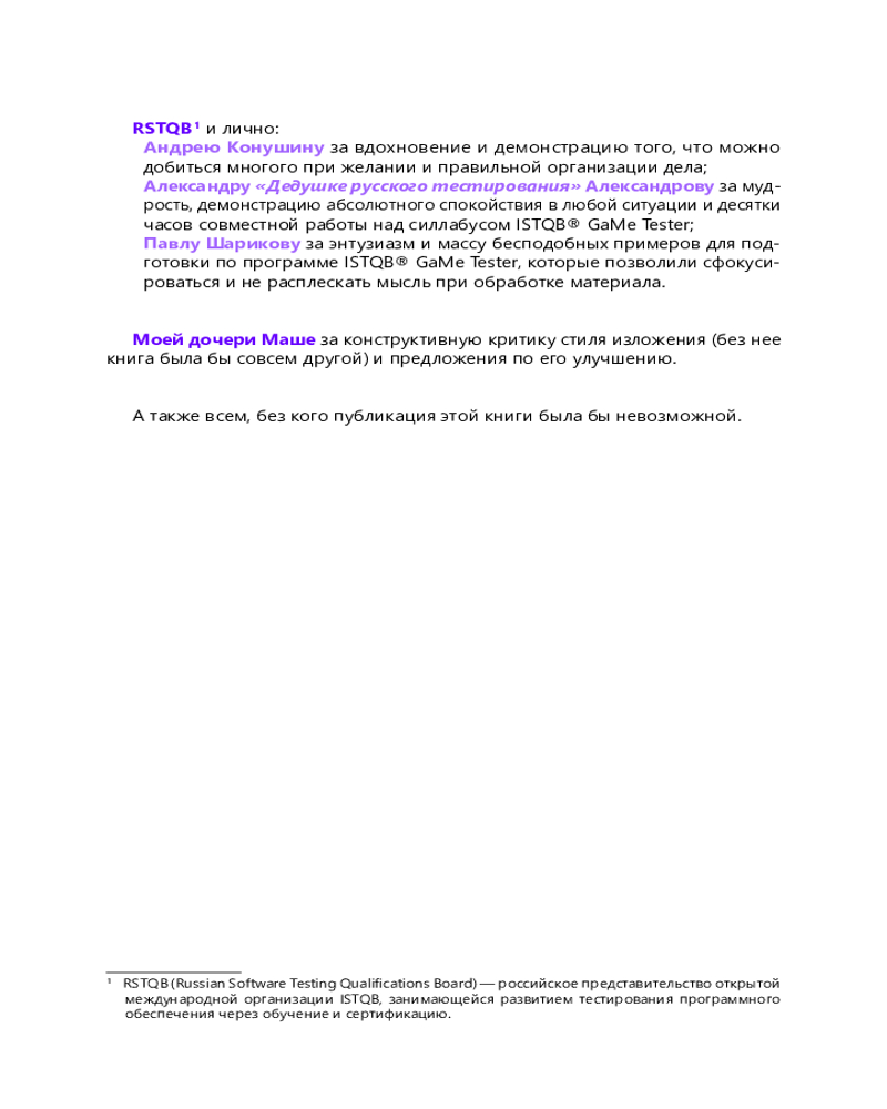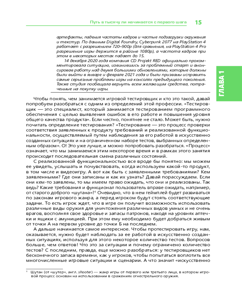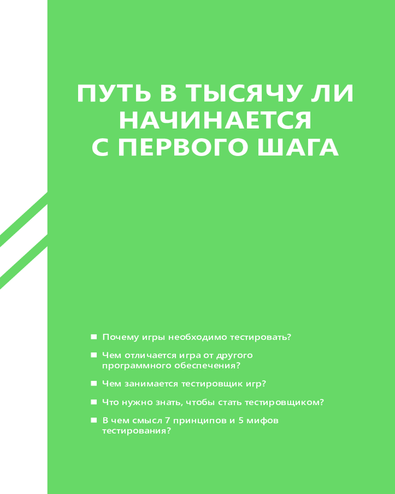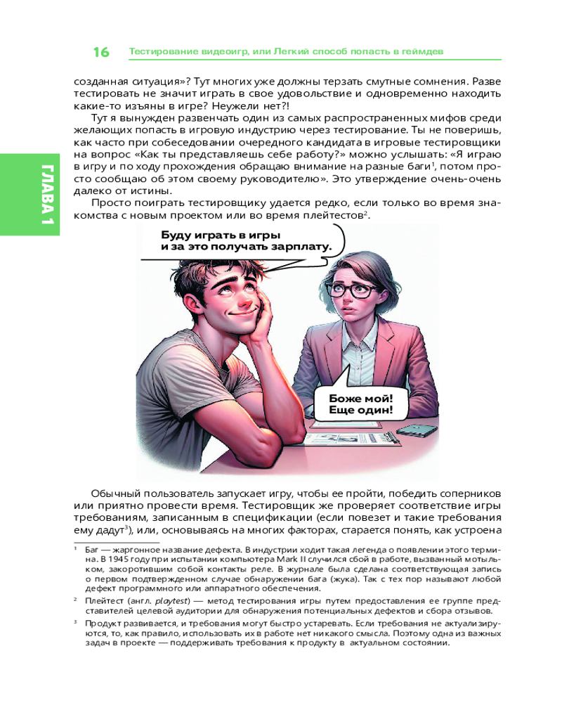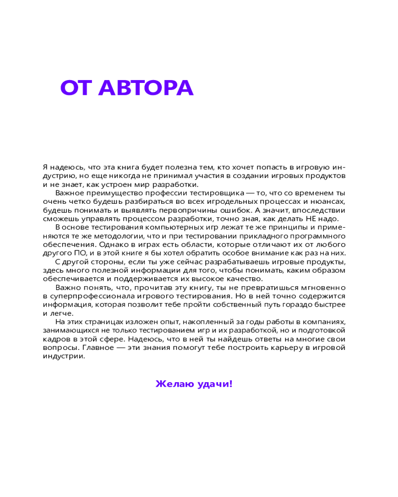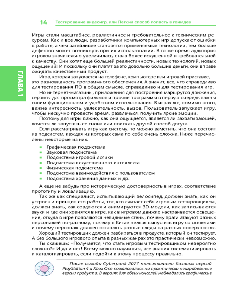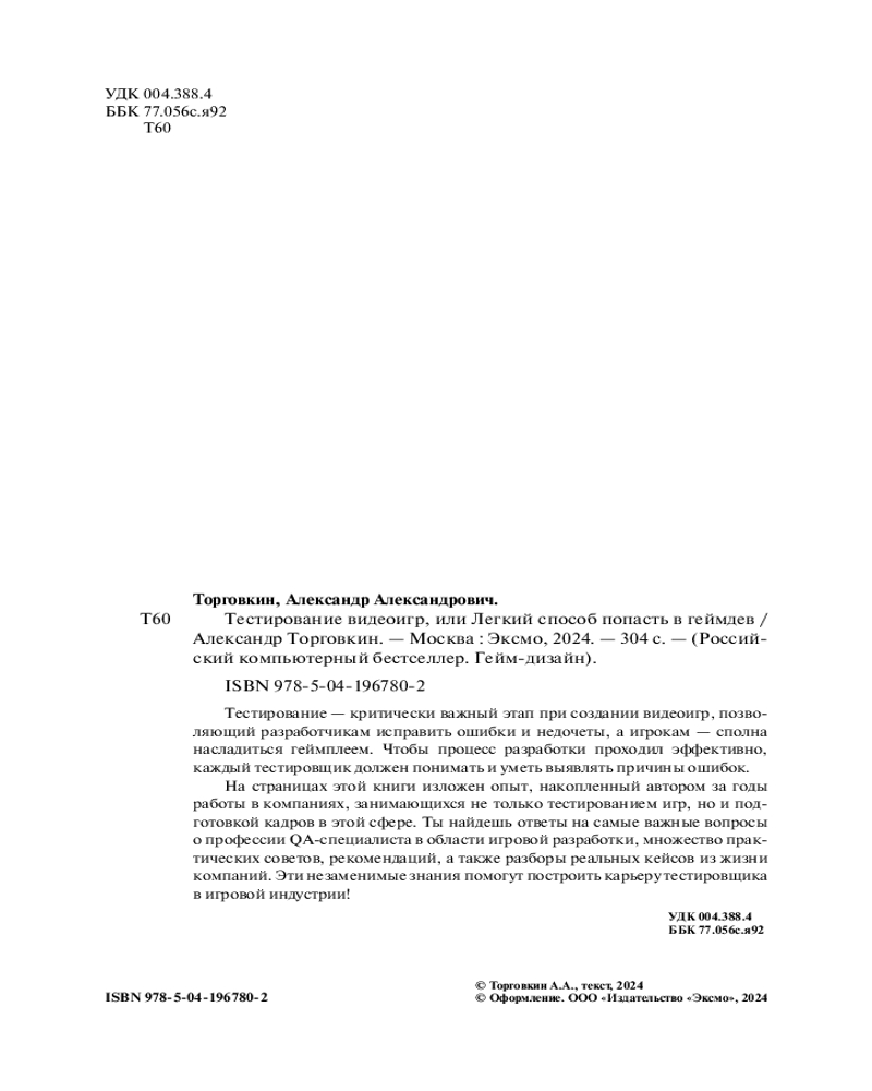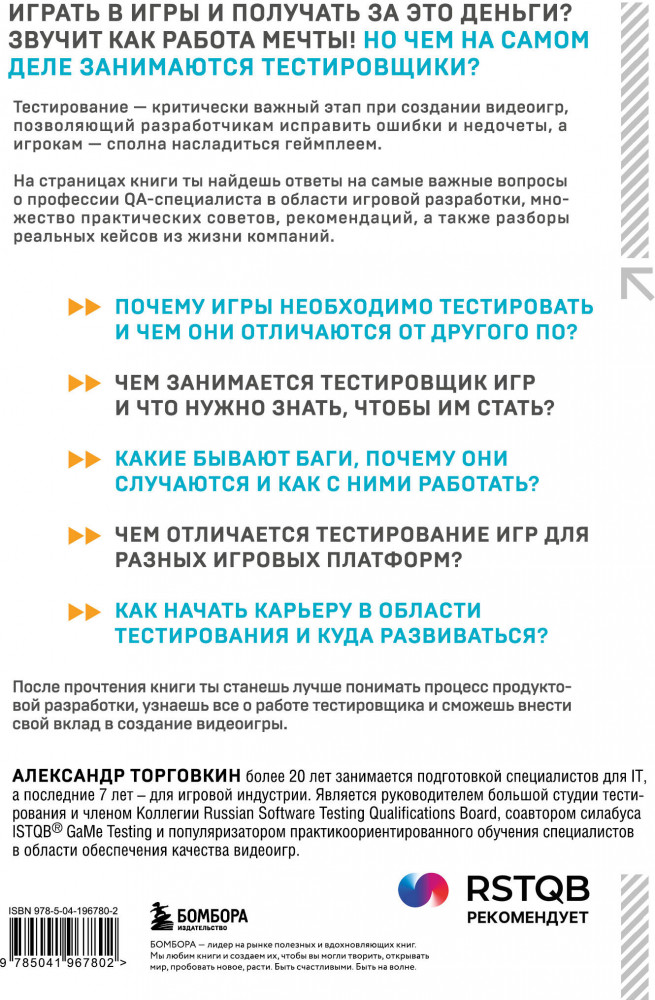 Тестирование видеоигр, или Легкий способ попасть в геймдевАлександр Александрович Торговкин В данный момент этот товар отсутствует в продаже. Возможно, у нас найдется аналогичный или похожий товар здесь. Серия: Российский компьютерный бестселлер. Гейм-дизайн Играть в игры и получать за это деньги? Звучит как работа мечты! Но чем на самом деле занимаются тестировщики? Тестирование — критически важный этап при создании видеоигр, позволяющий разработчикам исправить ошибки и недочеты, а игрокам — сполна насладиться геймплеем. На страницах книги ты найдешь ответы на самые важные вопросы о профессии QA-специалиста в области игровой разработки, множество практических советов, рекомендаций, а также разборы реальных кейсов из жизни компаний. После прочтения книги ты станешь лучше понимать процесс продуктовой разработки, узнаешь все о работе тестировщика и сможешь внести свой вклад в создание видеоигры. |