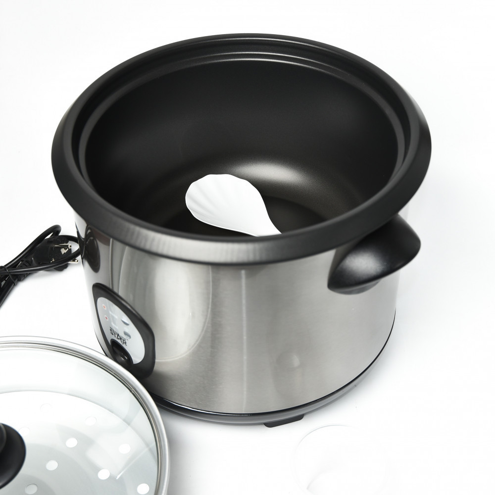 Эта элегантная и функциональная электрическая рисоварка станет незаменимым помощником на вашей кухне. Изготовленная с использованием высококачественных материалов, она сочетает в себе прочные детали из нержавеющей стали и стильные чёрные пластиковые элементы, что придает устройству современный вид и долговечность.