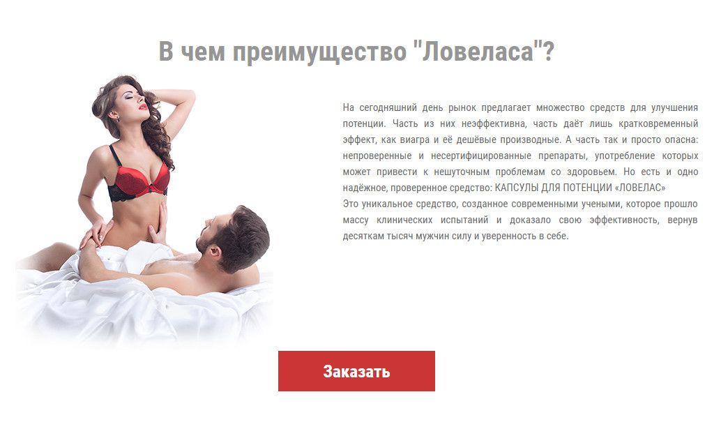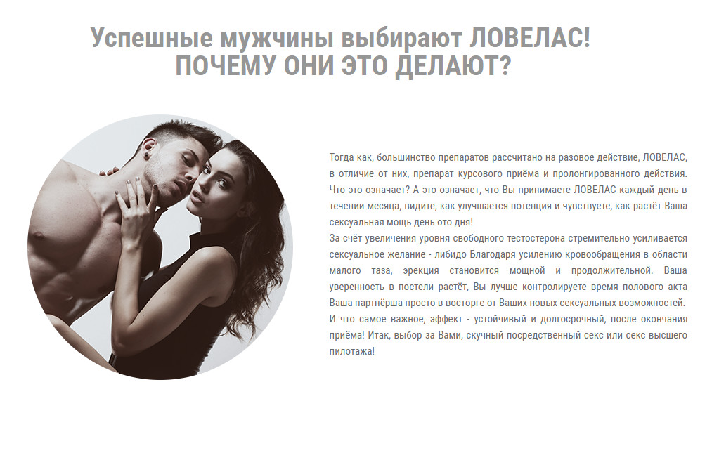 Средство капсулы для потенции и эрекции Ловелас Форте — биологически активная добавка для улучшения сексуального здоровья мужчин. Препарат для потенции и для возбуждения Ловелас Форте — это яркий длительный секс, физическая выносливость, жизненный тонус. Максимальная эффективность при курсовом приеме! Ежедневный прием таблетки для потенции способствует улучшению потенции и повышению сексуальной активности. В основе таблетки для эрекции проверенная российским потребителем, эффективная и безопасная формула, которая содержит 9 биокомпонентов. Эффективность каждого из компонентов подтверждена исследованиями и практикой применения. В составе формулы они усиливают действие друг друга и обеспечивают синергический эффект. В отличие от многих других препаратов, в состав которых входят обычные экстракты растений и синтетические продукты, возбуждающее средство для мужчин Ловелас Форте содержит экстракты, стандартизированные на содержание активных действующих веществ оказывающие комплексное воздействие на организм мужчины. Усиливают кровообращение полового члена, улучшают состояние нервной системы, повышают выносливость, способствуют усилению выработки организмом мужского полового гормона тестостерона. Это и даёт долговременный эффект улучшения эрекции, усиления полового влечения и подъема жизненного тонуса мужчины.