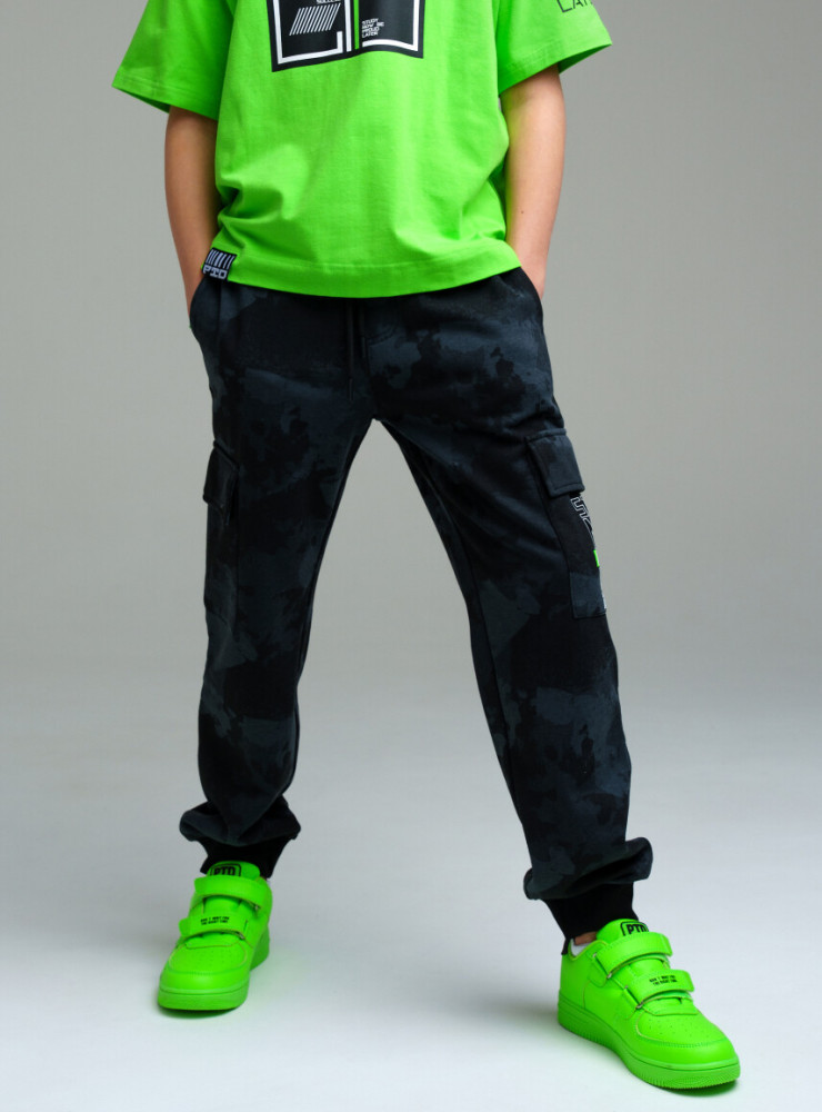 Брюки карго из french terry. Посадка comfort fit. Функциональные карманы в боковых швах, а также накладные карманы на липучках. Эластичный пояс со шнурком.