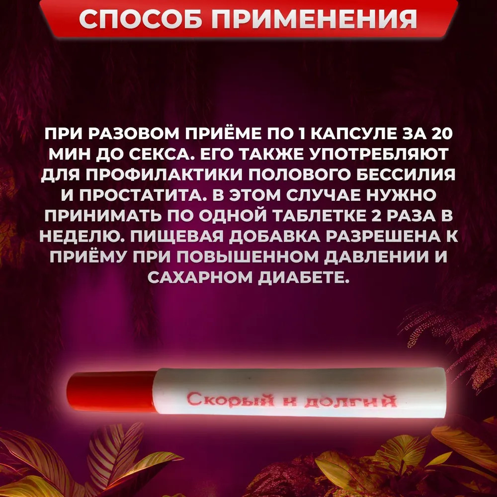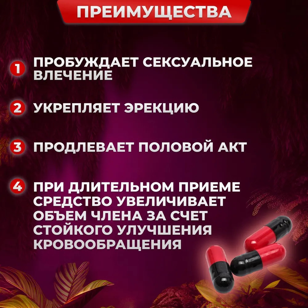 Простота и Удобство Применения. Препарат представлен в удобной форме капсул, что делает его применение максимально простым и комфортным. Одна капсула за 30 минут до полового акта — и вы готовы к новым сексуальным победам. Это особенно удобно для тех, кто не хочет заморачиваться с сложными инструкциями и режимами приема.