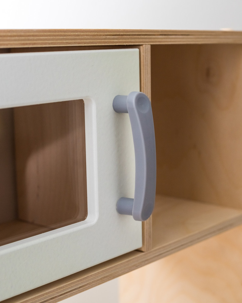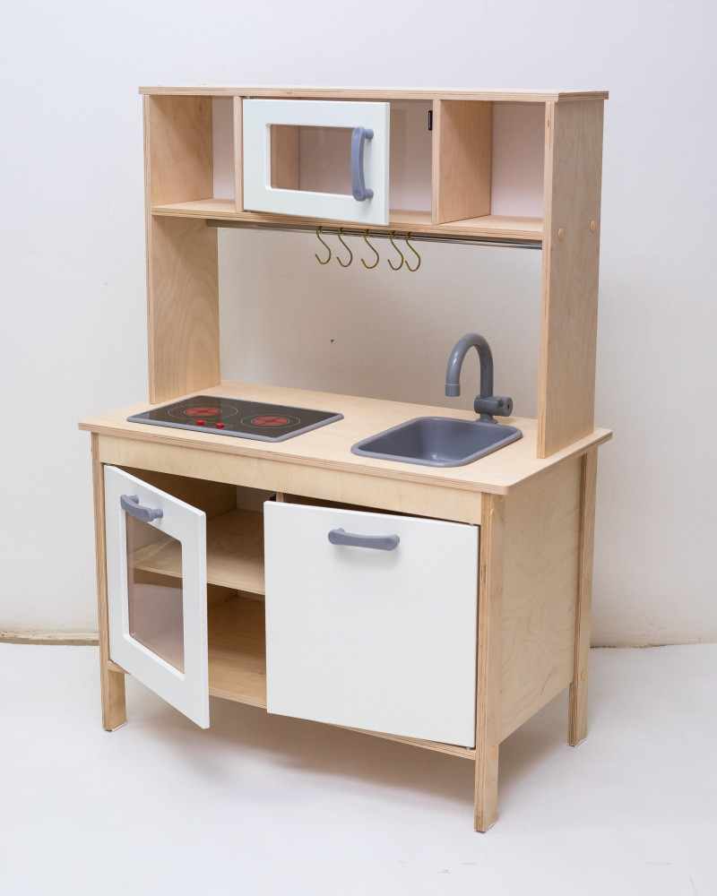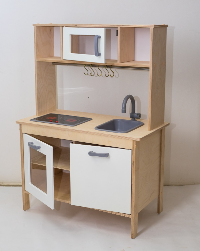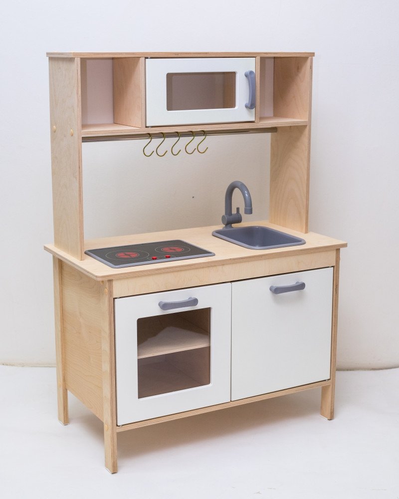В данный момент этот товар отсутствует в продаже. Возможно, у нас найдется аналогичный или похожий товар здесь. Большая детская кухня с белыми фасадами девочке из дерева прекрасно подойдет для детской комнаты. Детская игрушечная кухня — это не только источник веселья и развлечения для детей, но и отличная возможность развить у них интерес к кулинарии и домашней работе. Играя с деревянной детской кухней, малыши могут почувствовать себя настоящими поварами и хозяевами. Игровая кухня, позволяет ребенку окунуться в мир готовки и сервировки блюд. Большая детская деревянная кухня станет отличным подарком для маленьких девочек и мальчиков, заинтересованных в играх в доме. Кухня для детей выполнена из высококачественного дерева, что делает ее прочной и долговечной. Игрушечная кухня включает в себя кран, плиту, и множество полочек и шкафчиков для удобства хранения игрушек и посуды. Игрушечная кухня предлагает детям множество возможностей для творчества и игр. Благодаря различным элементам — дверкам, полочкам, крану и плите, дети могут устраивать настоящие кулинарные шоу и соревнования. Белые шкафы и полочки кухни создают ощущение уюта и чистоты, что способствует приятной атмосфере для проведения игр. Двери шкафов легко открываются и закрываются, что позволяет малышам привыкнуть к механике использования различных предметов.