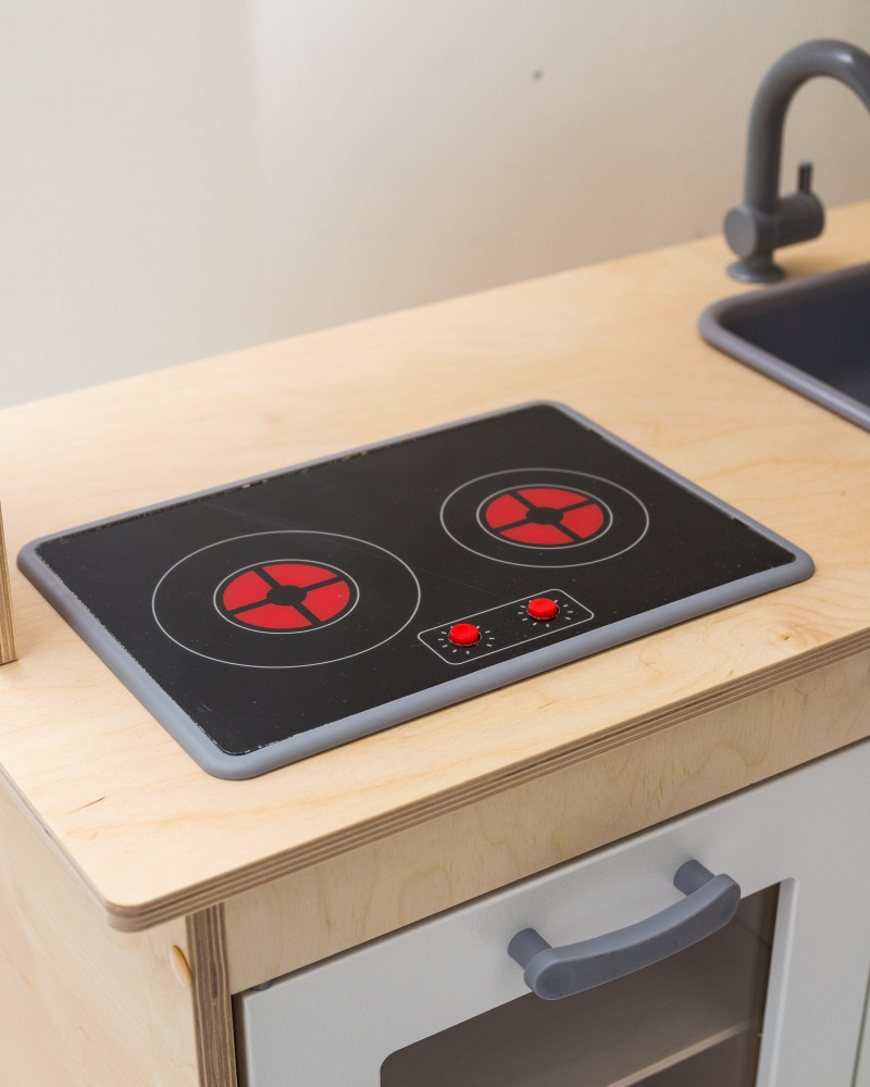 Игровая кухня для девочек и мальчиков очень удобная и функциональная. Дверцы открываются, внутри полочки. Интерактивная кухня имеет варочную панель . Особенный интерес в игрушке представляет раковина с краном. Деревянный кухонный набор мебели в красочной, веселой игровой форме познакомит девочку и мальчика с основами поведения на кухне, правилами приготовления пищи, сервировки, оформления помещения. Практичная реалистичная современная детская кухня предлагает много полезных опций — для мамы это идеальная возможность подготовить себе настоящую помощницу, для дочки — любимая игрушка с неограниченным набором функций и ролевых игр.