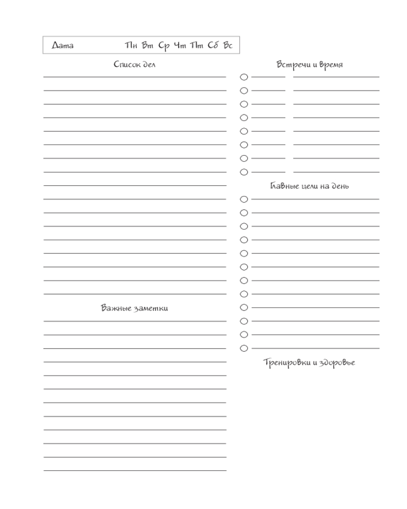 • сетка блока создана с учетом современных тенденций европейского дизайна: часть распределена по времени — для ваших рабочих дедлайнов, а другая часть — линейки, которые можно использовать как для личных заметок, так и для планирования рабочих задач.