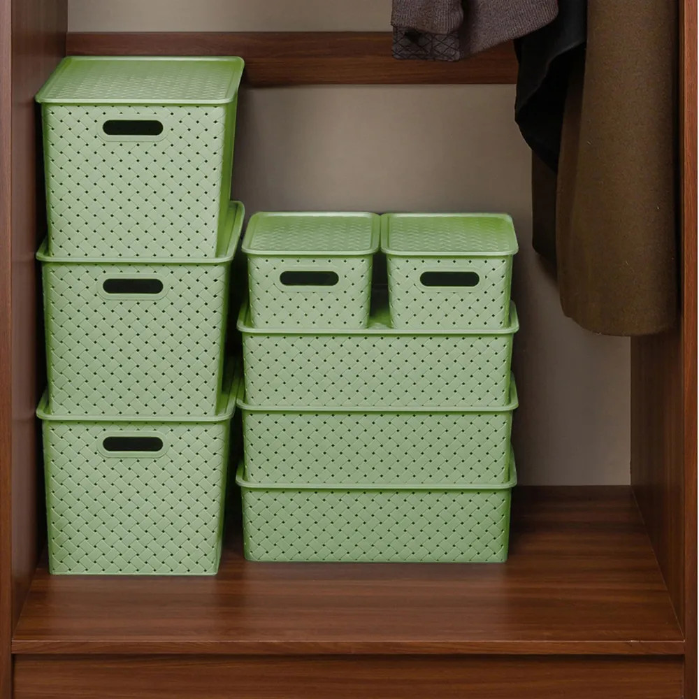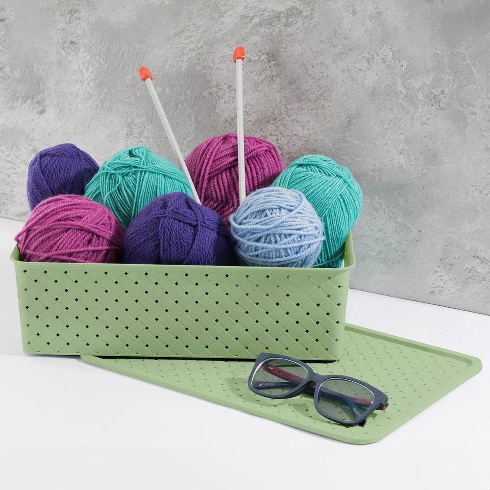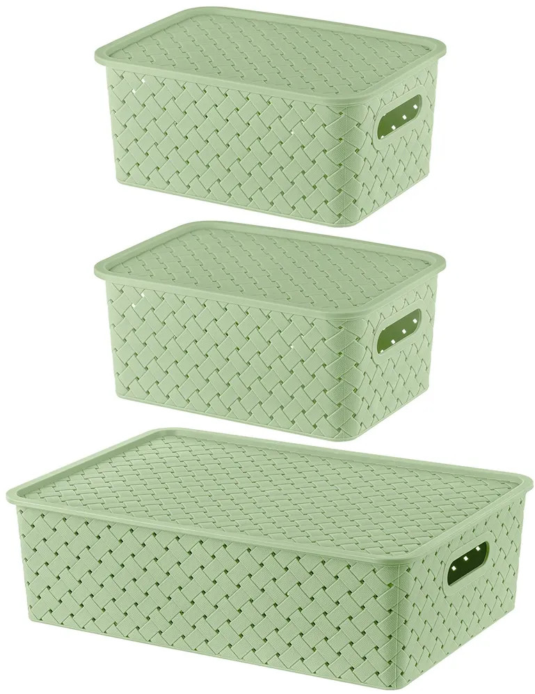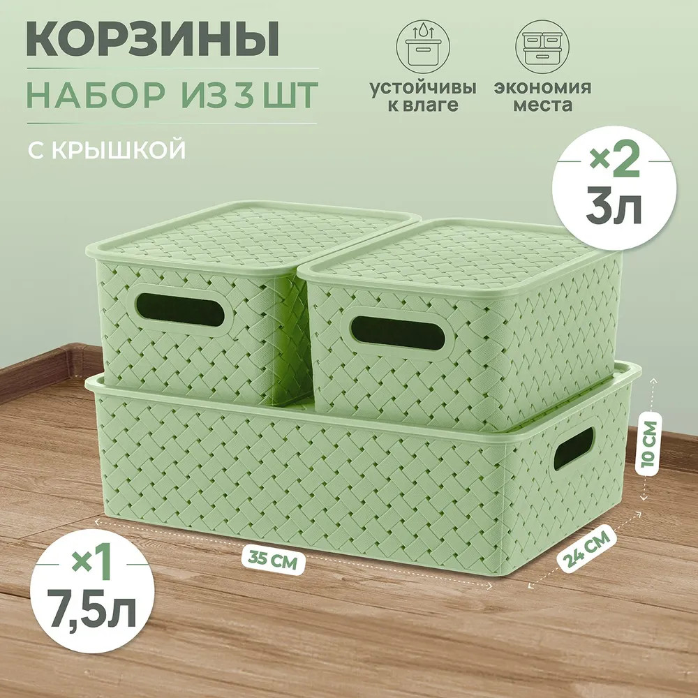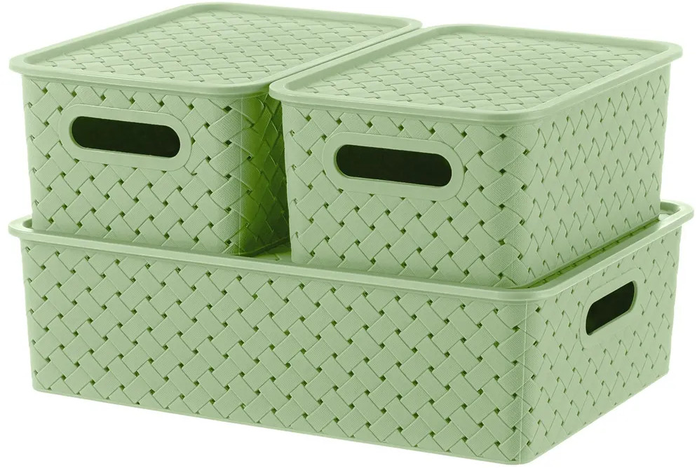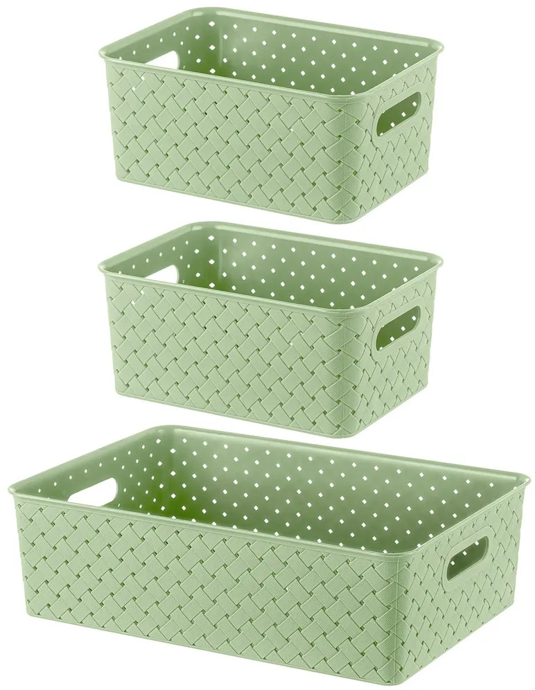 Набор из трех корзин с ручками и крышками (7.5 литра, 3 литра) можно разместить на кухне, в ванной, прихожей, офисе, гараже или в шкафу. Большие коробки подойдут для бытовой химии, игрушек, одежды (для шапок, перчаток, белья, носков), а маленькие корзинки — для канцелярии, косметики, украшений, рукоделия (для пряжи, вязания) и других мелочей. Контейнеры 7,5 литра подойдут для документов и бумаги А4. Корзины выполнены из пищевого полипропилена и украшены декоративными рельефными узорами с отверстиями для вентиляции. Полностью безопасны и подходят для продуктов. Используйте их для овощей, как хлебницы или как фруктовые корзинки. Можно использовать как подарочные боксы: собрать наборы для мужчин и женщин, девушек и парней, мальчиков и девочек. Пластиковые корзины из серии «Береста» привлекательно выглядят и помогут создать систему для хранения вещей в едином стиле или гардеробную систему в вашей прихожей!
