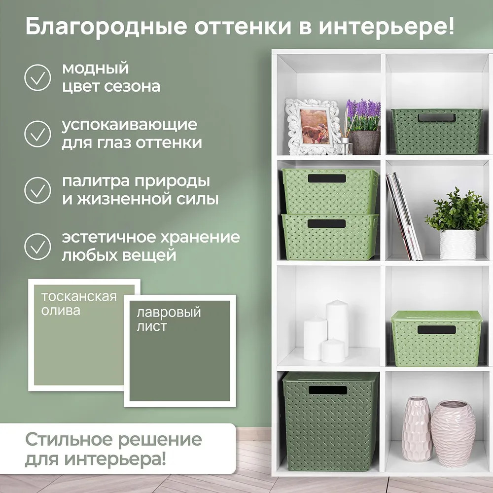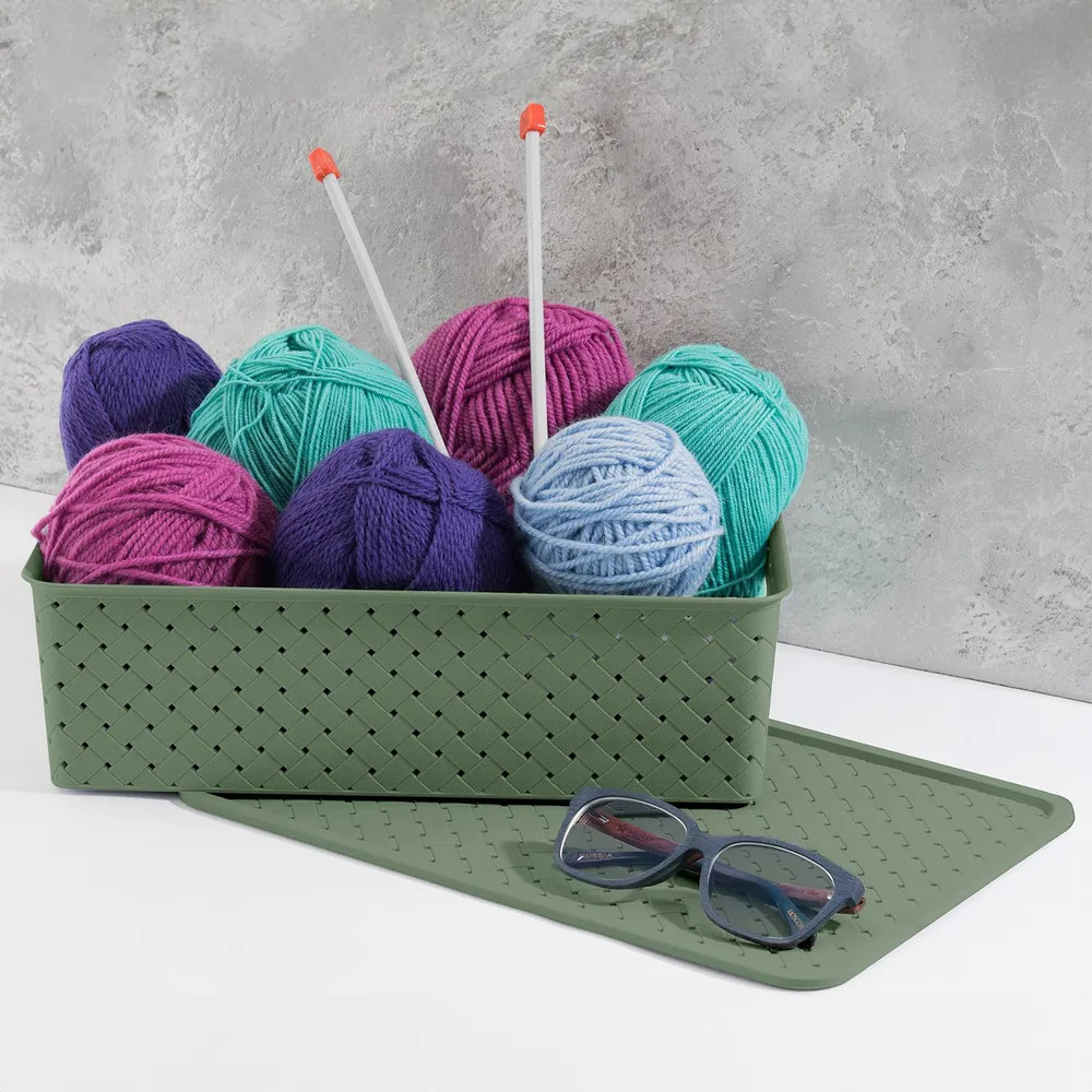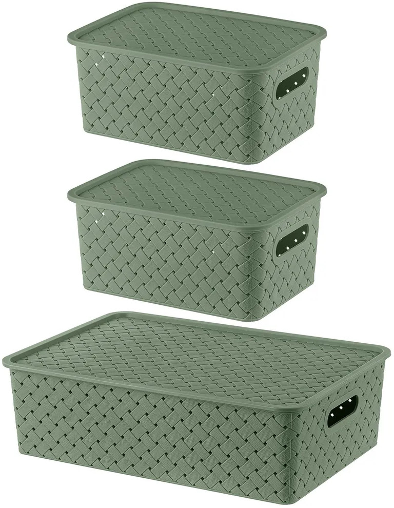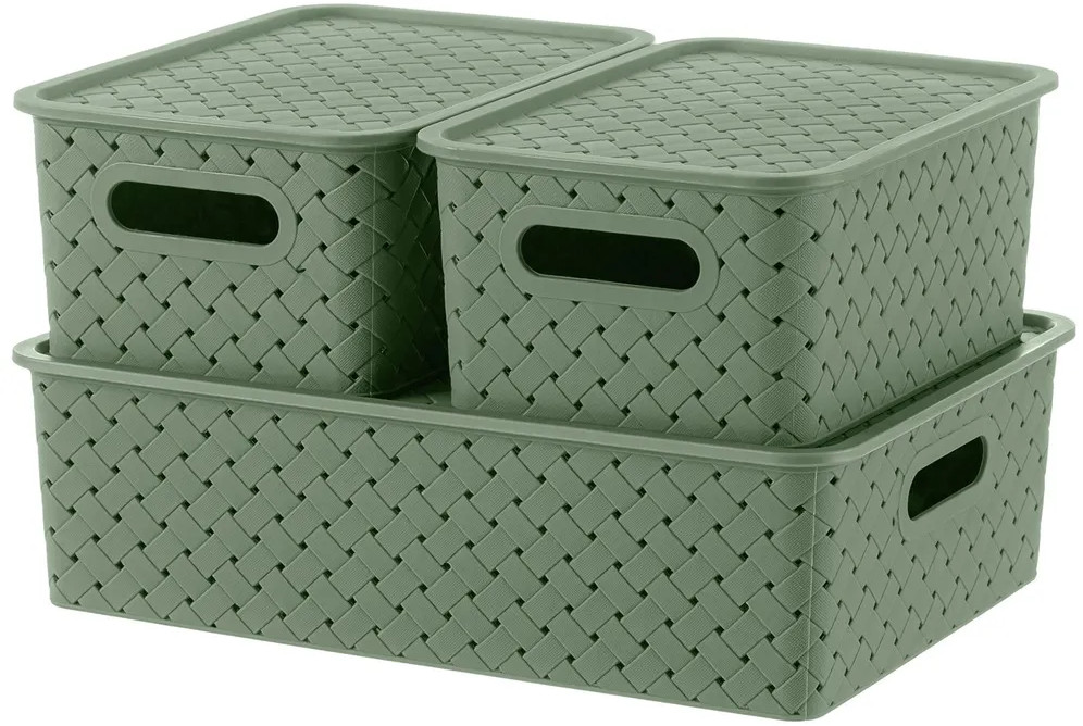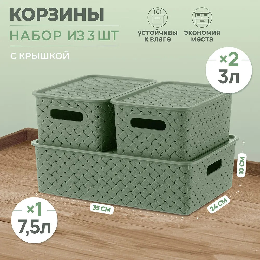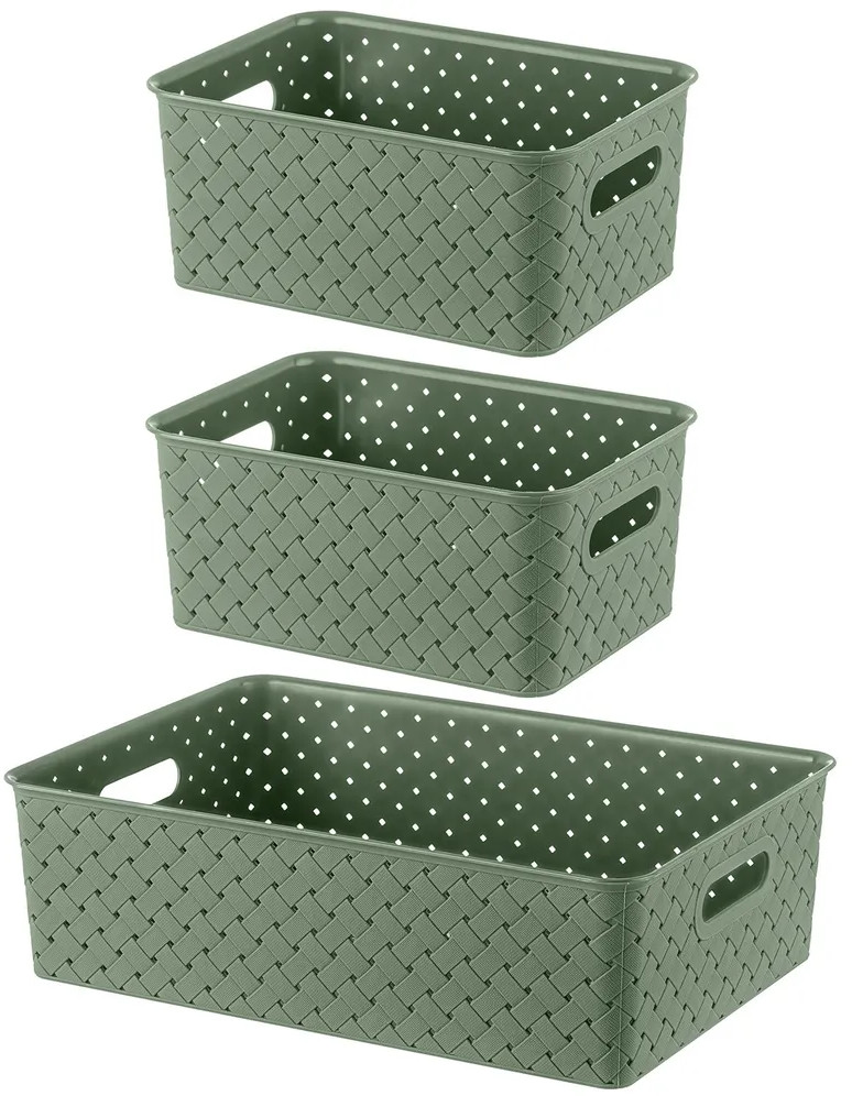 Набор из трех корзин с ручками и крышками (7.5 литра, 3 литра) можно разместить на кухне, в ванной, прихожей, офисе, гараже или в шкафу. Большие коробки подойдут для бытовой химии, игрушек, одежды (для шапок, перчаток, белья, носков), а маленькие корзинки — для канцелярии, косметики, украшений, рукоделия (для пряжи, вязания) и других мелочей. Контейнеры 7,5 литра подойдут для документов и бумаги А4. Корзины выполнены из пищевого полипропилена и украшены декоративными рельефными узорами с отверстиями для вентиляции. Полностью безопасны и подходят для продуктов. Используйте их для овощей, как хлебницы или как фруктовые корзинки. Можно использовать как подарочные боксы: собрать наборы для мужчин и женщин, девушек и парней, мальчиков и девочек. Пластиковые корзины из серии «Береста» привлекательно выглядят и помогут создать систему для хранения вещей в едином стиле или гардеробную систему в вашей прихожей!