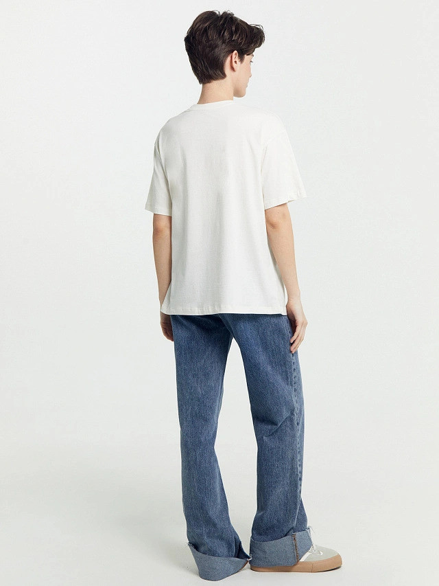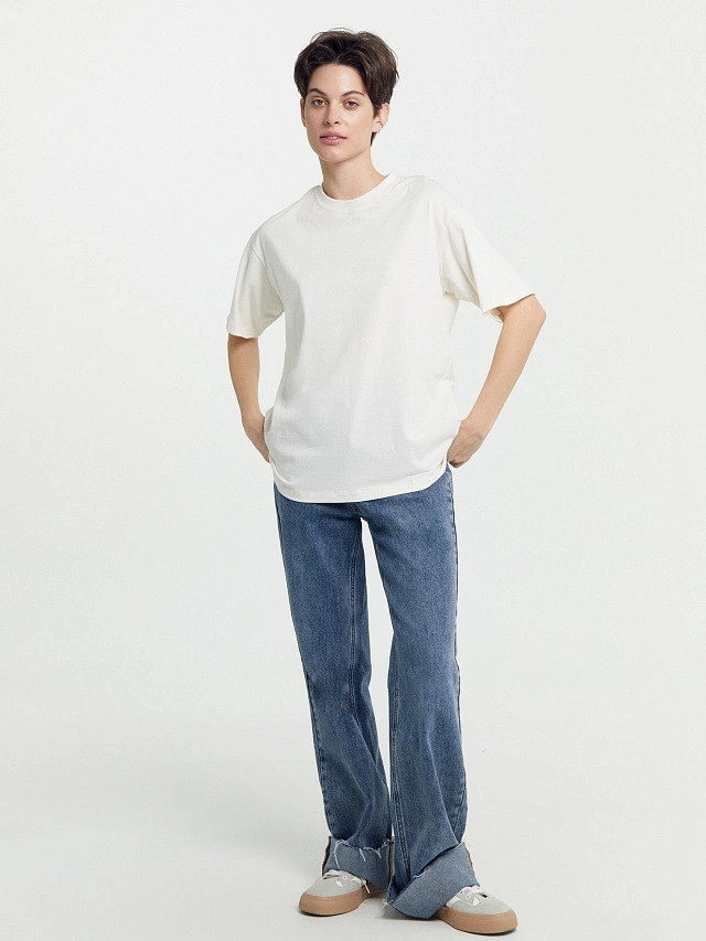 Приятный молочный цвет, свободный крой, взяла 46, хотя я ношу иногда 48, 46 хорошо села, очень понравилась футболка, заказала ещё одну, ничего лишнего, свободная базовая футболка