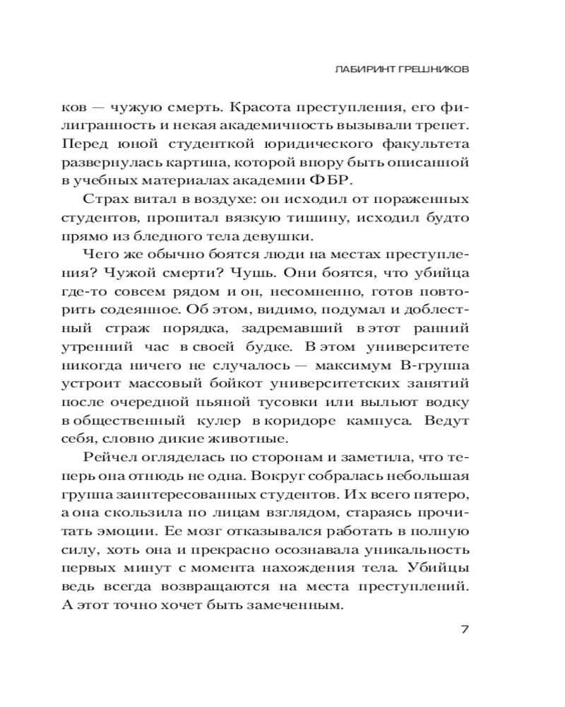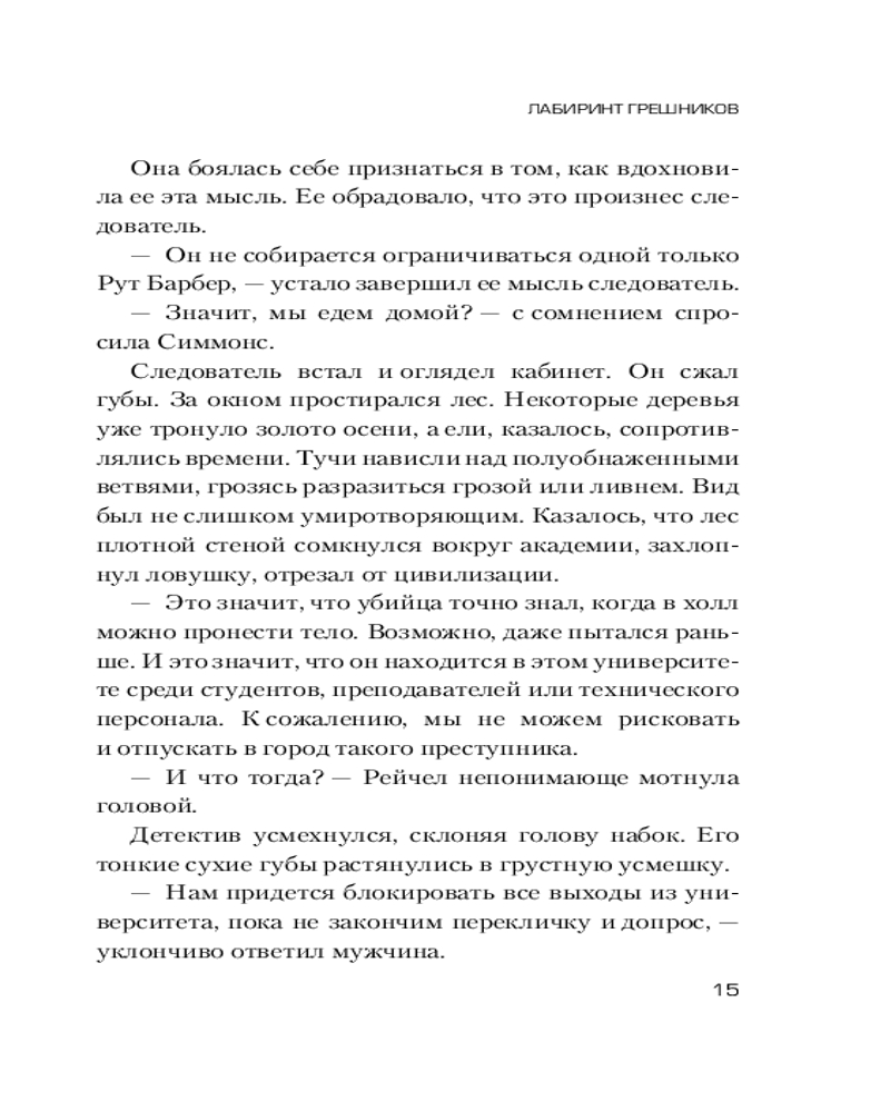 Серия: Убийца среди нас. Герметичный детектив Будни студентов Лейксайдского колледжа многим показались бы раем — богатая жизнь, тусовки и никаких забот. Но у каждого из них есть свои скелеты в шкафу и грехи, за которые неизбежно придётся платить. Теперь за учащимися охотится изощренный серийный убийца, карающий грешников. И его уже не остановить... Рейчел Симмонс, студентке кафедры криминалистики, предстоит вычислить убийцу в закрытом кампусе посреди глухого леса, чтобы выйти живой из этого темного лабиринта страха и подозрений. |