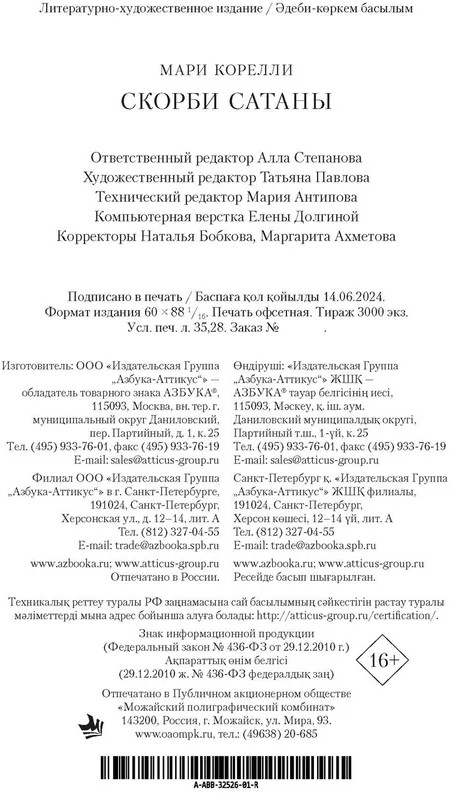 💳 Оплатить за товар можно при получении 🇰🇿 Есть бесплатная доставка по Казахстану от 1 дня 🎁 Копите бонусы с каждой покупки Серия: The Big Book Роман «Скорби Сатаны» Мари Корелли (такой звучный псевдоним взяла себе англичанка Мэри Маккей) был опубликован в 1895 году и стал одним из крупнейших литературных событий Викторианской эпохи. Он имел чрезвычайный успех у читателей, побив все возможные рекорды продаж. Когда на писательницу ополчились критики, ее поддержал Оскар Уайльд, чей роман «Портрет Дориана Грея», написанный пятью годами ранее, во многом предвосхитил появление «Скорбей Сатаны». Обратившись к популярному сюжету о сделке с дьяволом, Мари Корелли создала один из самых неоднозначных в мировой литературе образов Сатаны: в ее романе это герой, не желающий зла, но творящий его, искушающий людей, но живущий надеждой на то, что они преодолеют свои желания и перестанут грешить. Читателей ждут нетривиальные сюжетные повороты и фантасмагорический финал. Интересно, что первое русскоязычное издание романа (1903) увидело свет под именем Брэма Стокера, автора романа о Дракуле. В результате этой ошибки в России авторство «Скорбей Сатаны» долгое время приписывалось Стокеру. В наши дни роман Мари Корелли заслуженно признан классикой европейской мистики. |