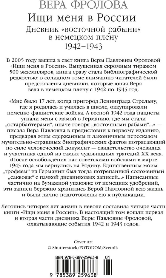 💳 Оплатить за товар можно при получении 🇰🇿 Есть бесплатная доставка по Казахстану от 1 дня 🎁 Копите бонусы с каждой покупки Серия: Персона В 2005 году вышла в свет автобиографическая книга Веры Павловны Фроловой «Ищи меня в России». Выпущенная скромным тиражом 500 экземпляров, книга немедленно стала библиографической редкостью: в солидном томе вниманию читателей были представлены дневники, которые юная Вера вела в немецком плену с 1942 по 1945 год. «Мне было 17 лет, когда пригород Ленинграда Стрельну, где я родилась и училась в школе, оккупировали немецко-фашистские войска. А весной 1942 года нацисты угнали меня с мамой в Германию, где мы стали „остарбайтерами“, иначе говоря „восточными рабами“...» — писала Вера Павловна в предисловии к первому изданию, предваряя этим сдержанным и лаконичным пересказом мучительно-страшных биографических фактов потрясающий по силе человеческий документ — свидетельство очевидца и участника одной из самых чудовищных трагедий XX века. «После освобождения нас советскими войсками в марте 1945 года мы вернулись на Родину. Единственным моим „трофеем“ из Германии был тогда потрепанный соломенный „саквояж“ с пачкой дневниковых записей...» Написанные частично на бумажной упаковке от немецких удобрений, эти записи бережно хранились Верой Павловной всю жизнь и были лично подготовлены ею к публикации. Летопись четырех лет жизни в неволе составила четыре части книги «Ищи меня в России». В настоящий том вошли первая и вторая части дневника Веры Павловны Фроловой, охватывающие события 1942 и 1943 годов. |