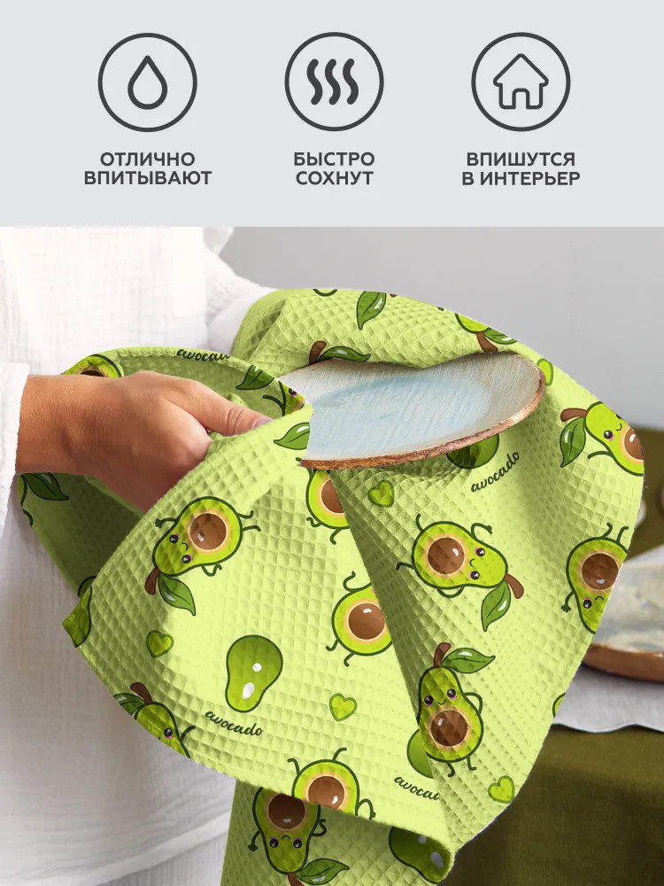 Серия: Avocado Комплект из пяти вафельных полотенец из серии «Avocado». Интересный принт — не как у всех! Полотенца выполнены из плотного, износостойкого вафельного полотна. Изготовлены из натурального хлопка, а за счет своей вафельной фактуры хорошо впитывают влагу и быстро высыхают. |