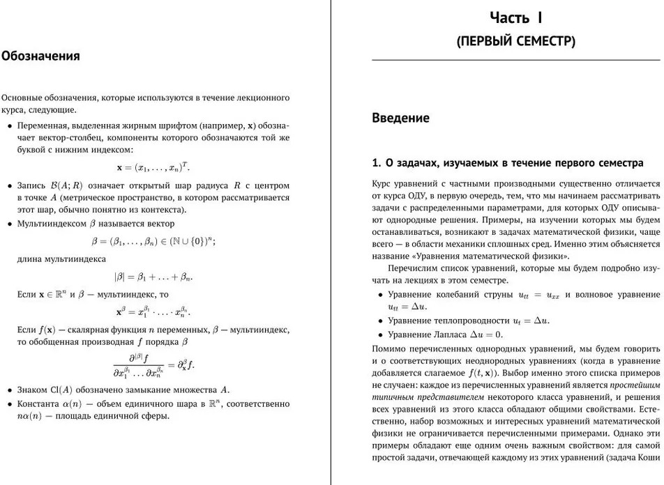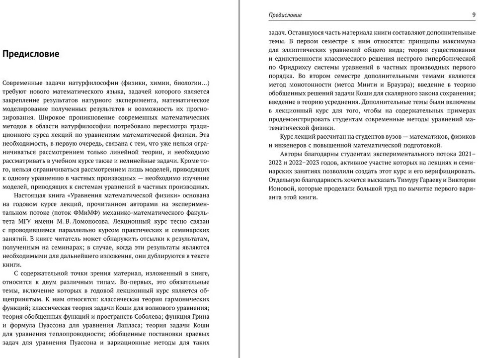 Уравнения математической физикиЕвгений Владимирович Радкевич, Владимир Владимирович Палин В данный момент этот товар отсутствует в продаже. Возможно, у нас найдется аналогичный или похожий товар здесь. Серия: Классический учебник МГУ Книга содержит конспекты всех лекций, проводившихся в 2021/2022 и 2022/2023 учебных годах на экспериментальном потоке механико-математического факультета Московского государственного университета имени М. В. Ломоносова (группа 341). С содержательной точки зрения материал, изложенный в книге, относится к двум различным типам. Во-первых, это обязательные темы, включение которых в годовой лекционный курс является общепринятым. К ним относятся: классическая теория гармонических функций; классическая теория задачи Коши для волнового уравнения; теория обобщенных функций и пространств Соболева; функция Грина и формула Пуассона для уравнения Лапласа; теория задачи Коши для уравнения теплопроводности; обобщенные постановки краевых задач для уравнения Пуассона и вариационные методы для таких задач. Чтобы на содержательных примерах продемонстрировать студентам современные методы уравнений математической физики, оставшуюся часть материала книги составляют дополнительные темы: принципы максимума для эллиптических уравнений общего вида; теория существования и единственности классического решения нестрого гиперболической по Фридрихсу системы уравнений в частных производных первого порядка; метод монотонности (метод Минти и Брауэра); введение в теорию обобщенных решений задачи Коши для скалярного закона сохранения; введение в теорию усреднения. |